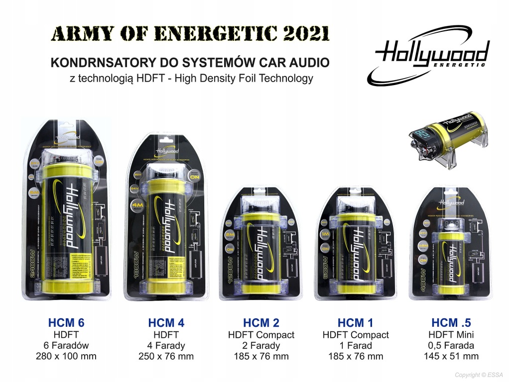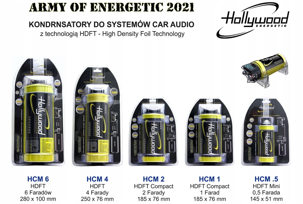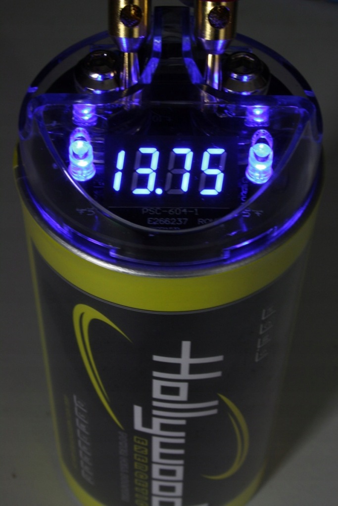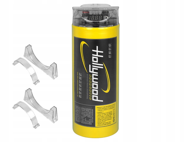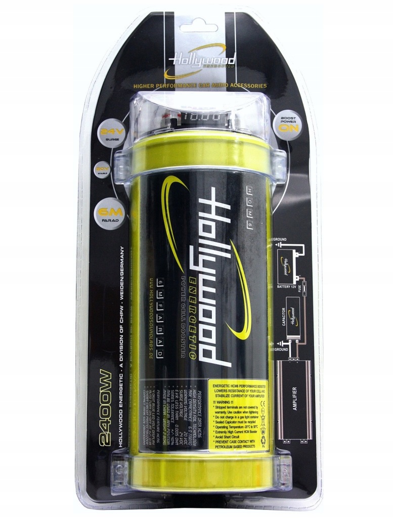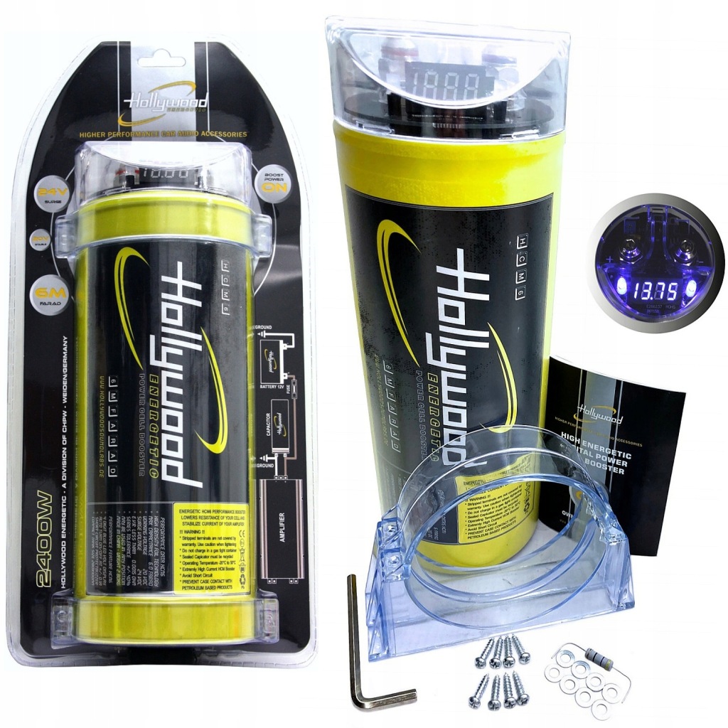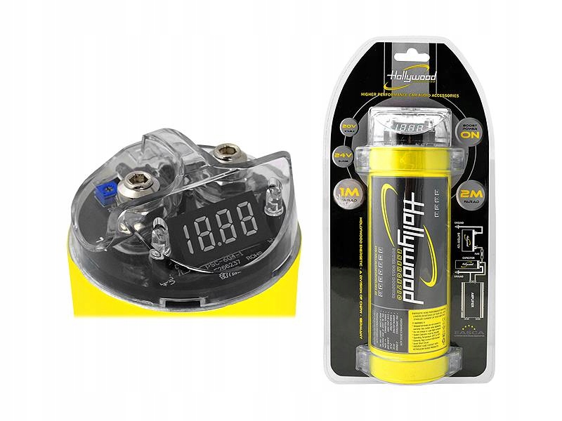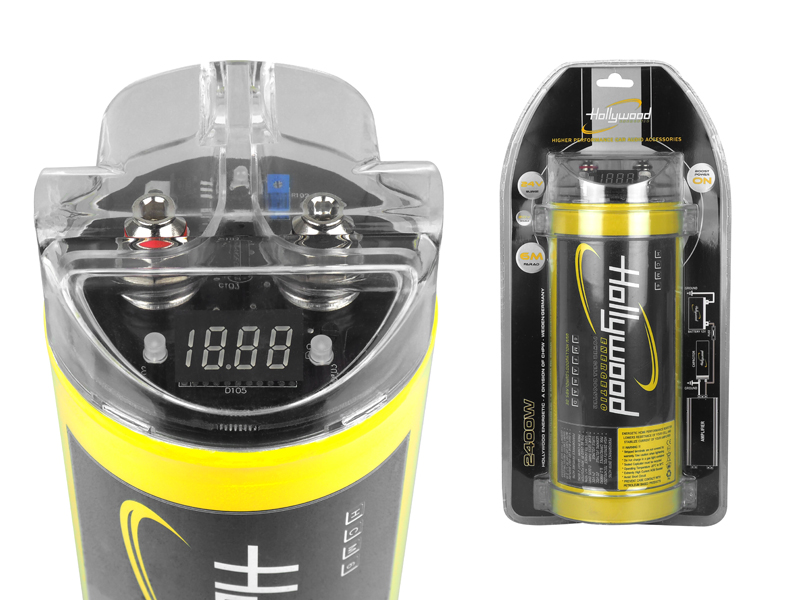 високоефективний конденсатор з ємністю 6 Фарадів з вольтметром німецького бренду Hollywood Energetic для поліпшення стабільності та ефективності установки живлення автомобільної аудіосистеми.завдяки використанню новітньої технології HDFT (High Density Foil Technology) з підвищеною щільністю внутрішніх електродних плівок стало можливим домогтися значно більш високої продуктивності в порівнянні зі старими конструкціями аналогічної ємності.