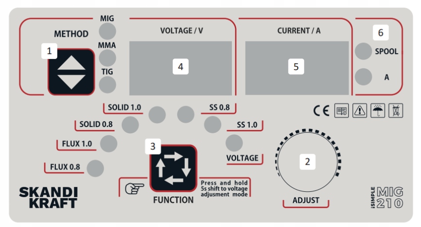 - вибір методу зварювання ( MIG / MMA / TIG / SPOOL GUN (для перемикання в режим spool gun необхідно утримувати кнопку 5 сек.)