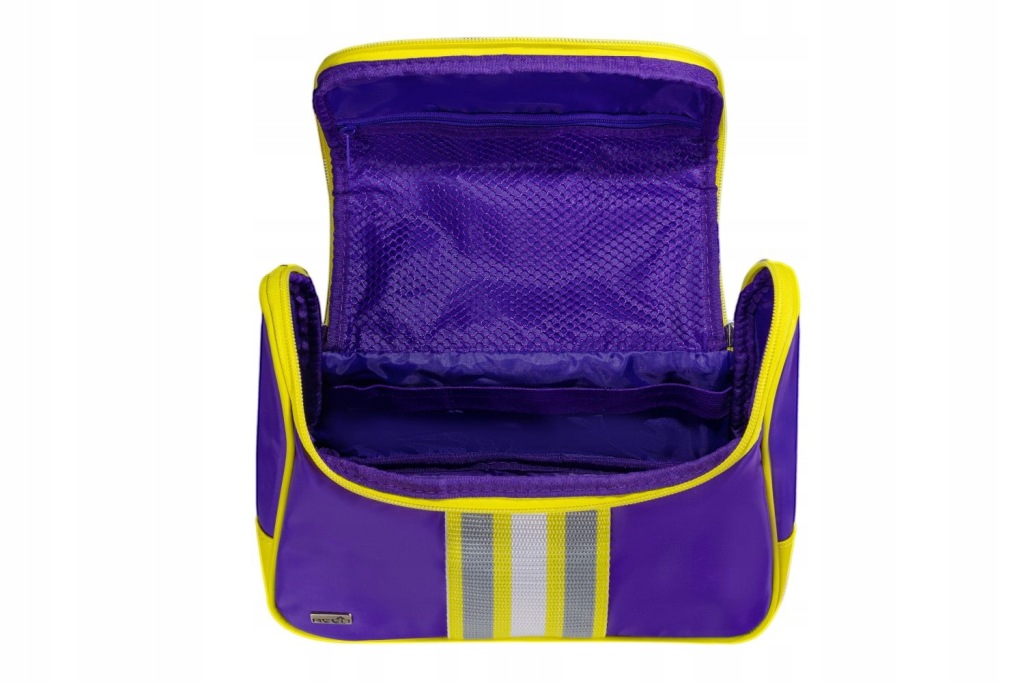 виготовлений з водонепроникного матеріалу темно-фіолетового кольору, прикрашеного сіро-жовтими смужками спереду.