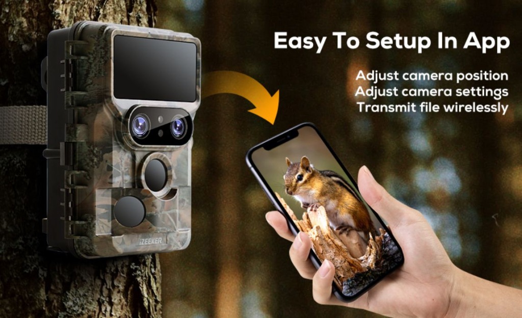 підключення WI-FI і просте регулювання кута - легко підключіть цю мисливську камеру до телефону за допомогою функції Wi-Fi. Ви можете налаштувати параметри, дивитися пряму трансляцію з камери стеження на екрані телефону, щоб налаштувати кут і положення, а також завантажувати контент прямо на телефон, не підключаючи камеру до компʼютера.
