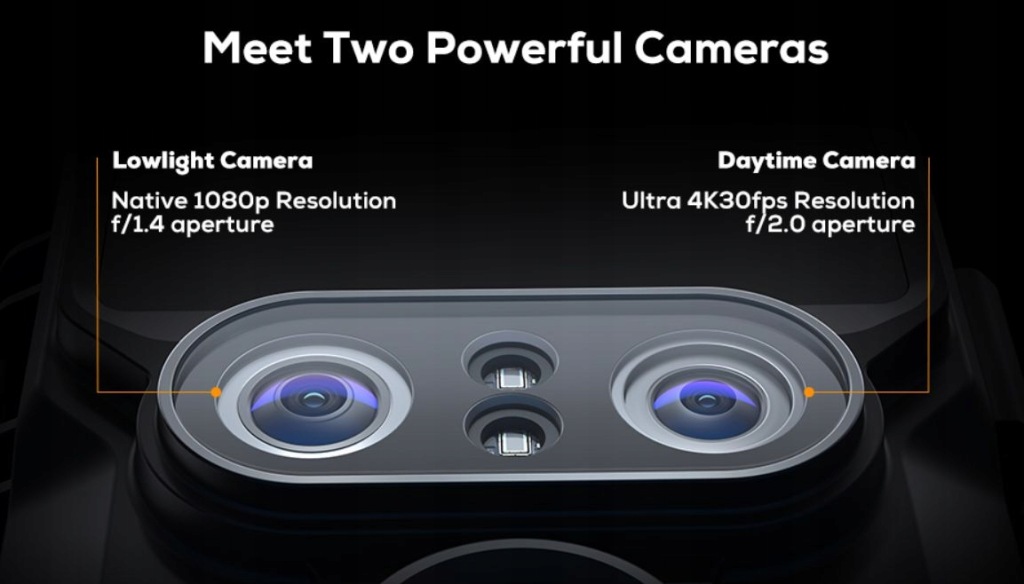 зображення з роздільною здатністю 48 Мп і відео 4K ULTRA HD оснащений 3 датчиками зображення SONY з високою роздільною здатністю, 2 різними обʼєктивами (один HD без спотворень для зйомки при денному світлі, один з широкою діафрагмою для зйомки при зоряному світлі) і 2 високопотужними 850 Нм низькими-завдяки легким світлодіодам камера з двома обʼєктивами захоплює більш чіткі зображення з роздільною здатністю 48 мегапікселів і більш плавні відео 4K Ultra HD.