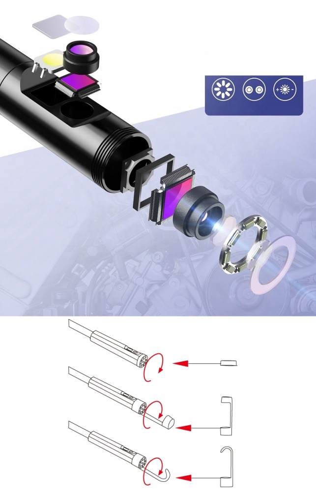 завдяки водонепроникності наконечника, де вбудовані камери, можна використовувати його навіть під водою. Камера буде працювати в будь-яких умовах і буде найбільш зручною формою ендоскопічної камери.ʼ