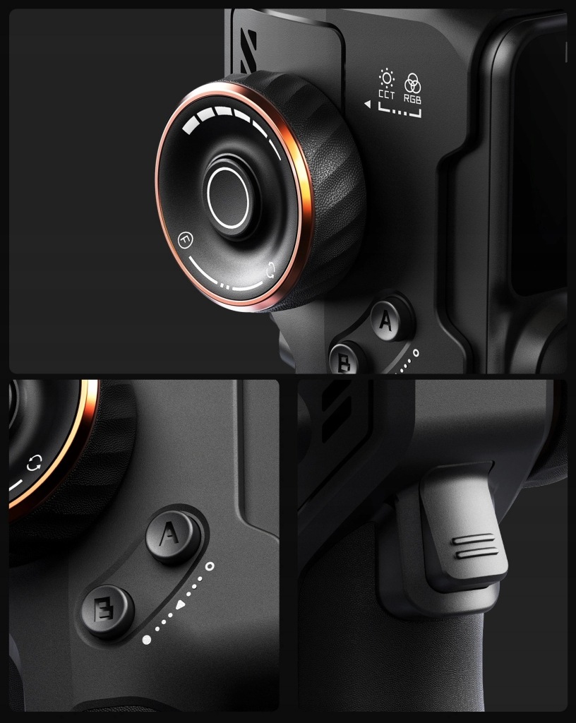 - дозволяє миттєво перевести стабілізатор в спортивний режим, швидко скинути вісь кардана або активувати відстеження AI. Його ергономічний дизайн гарантує зручність використання навіть під час тривалих сеансів запису.
