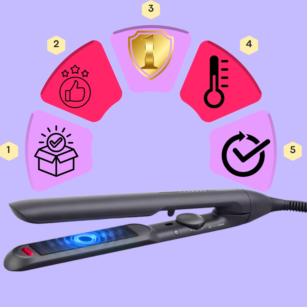 на відміну від інших випрямлячів, Philips пропонує передову технологію ThermoShield, яка піклується про волосся, зводячи до мінімуму теплове пошкодження. Завдяки іонізації і керамічним пластин з аргановою олією волосся стає блискучим, гладкими і здоровими – незалежно від типу укладання.