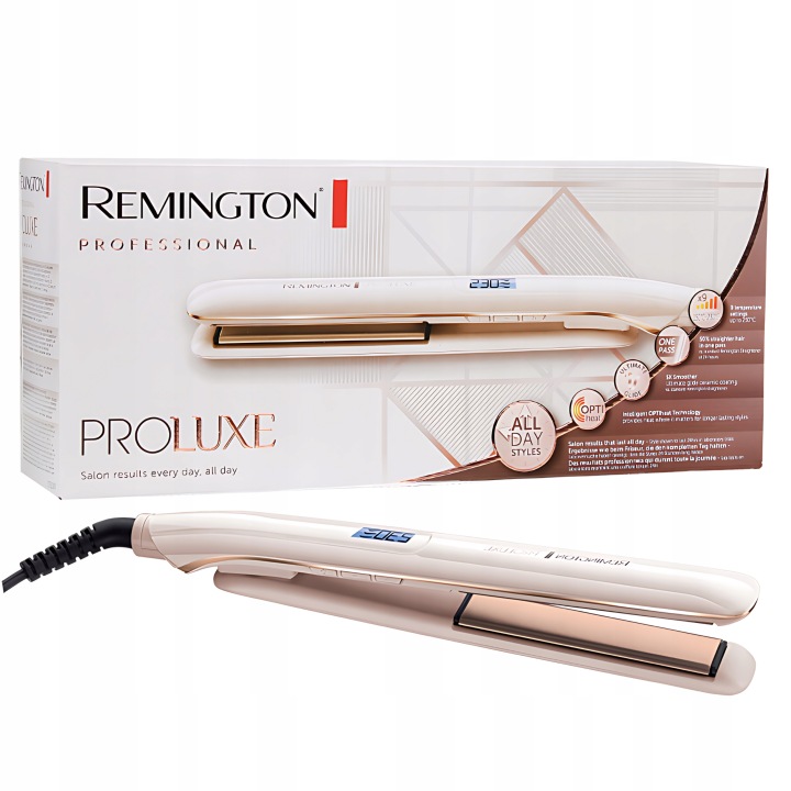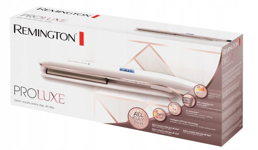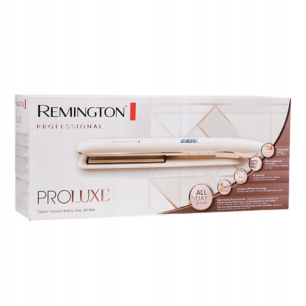 ► випрямляч REMINGTON PROLuxe використовує технологію OPTIHeat, яка точно подає тепло в місця, які найбільше цього потребують, щоб забезпечити довговічність укладання протягом усього дня.