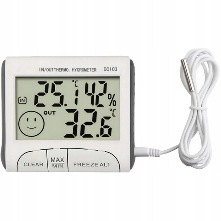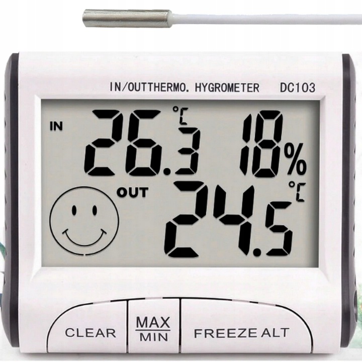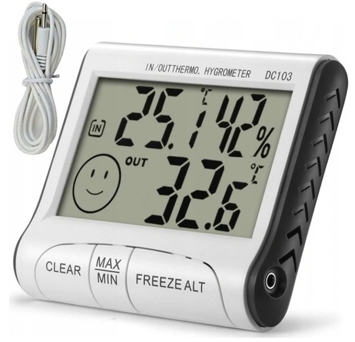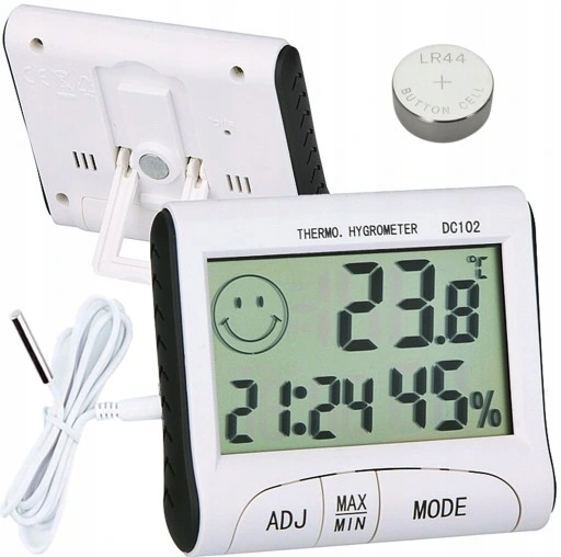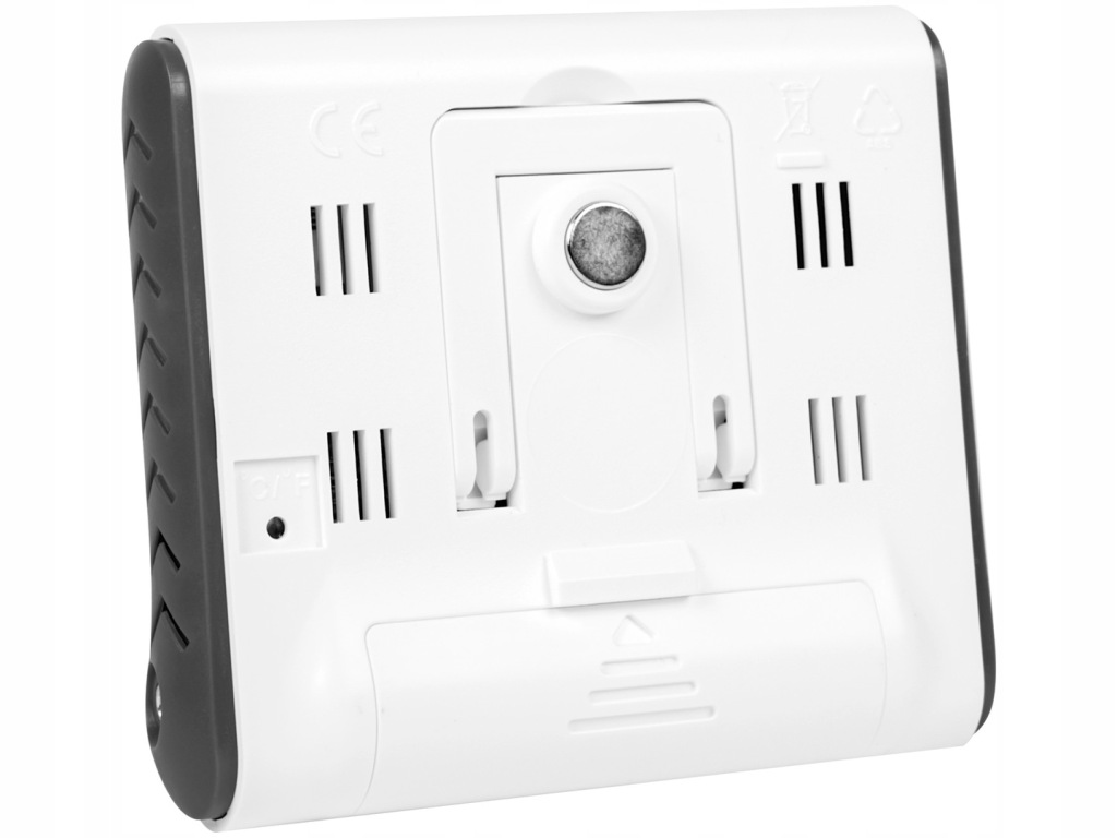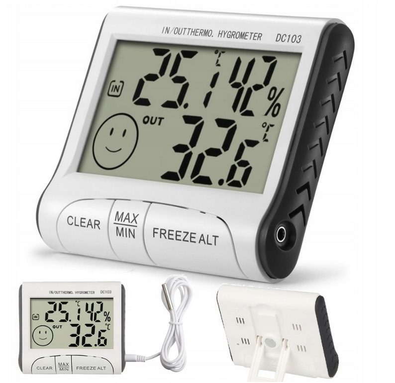 гігрометр є точним пристроєм використовується для вимірювання вологості повітря в кімнаті як добре, як температура всередині і зовні. Набір включає в себе пробу для зовнішніх вимірювань . Зʼєднайте його з пристроєм і вставте інший кінець з вікна. Пристрій має стабільну ногу на житло і магніт, спасибі, що станція може бути розміщена на металевих прибоях. Це було локалізовано на задній кришці.