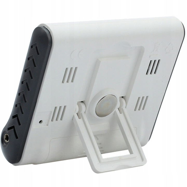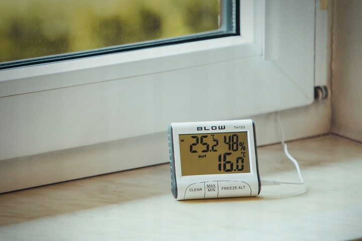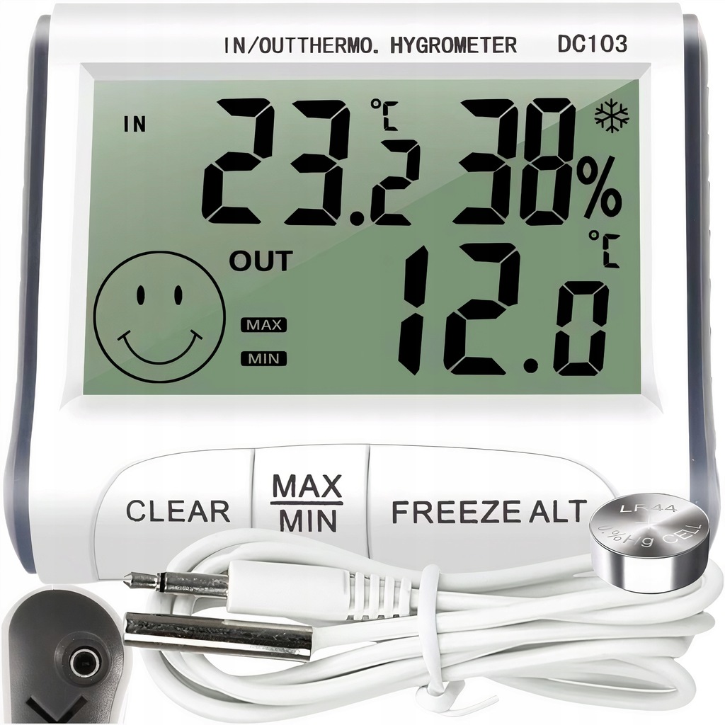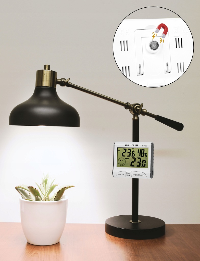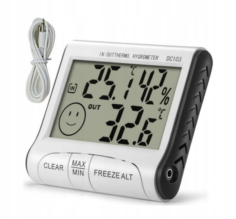 гігрометр є точним пристроєм використовується для вимірювання вологості повітря в кімнаті як добре, як температура всередині і зовні. Набір включає в себе пробу для зовнішніх вимірювань . Зʼєднайте його з пристроєм і вставте інший кінець з вікна. Пристрій має стабільну ногу на житло і магніт, спасибі, що станція може бути розміщена на металевих прибоях. Це було локалізовано на задній кришці.