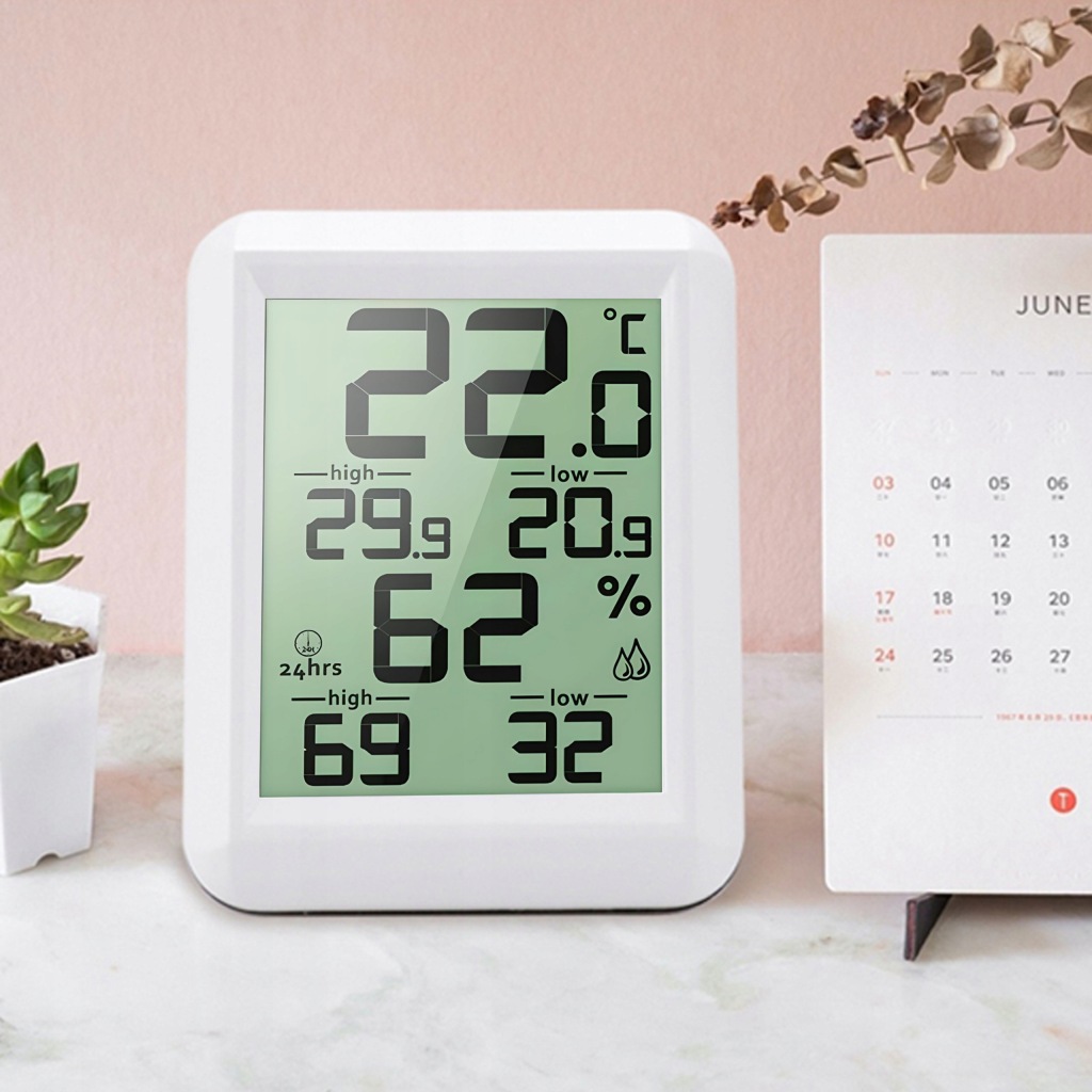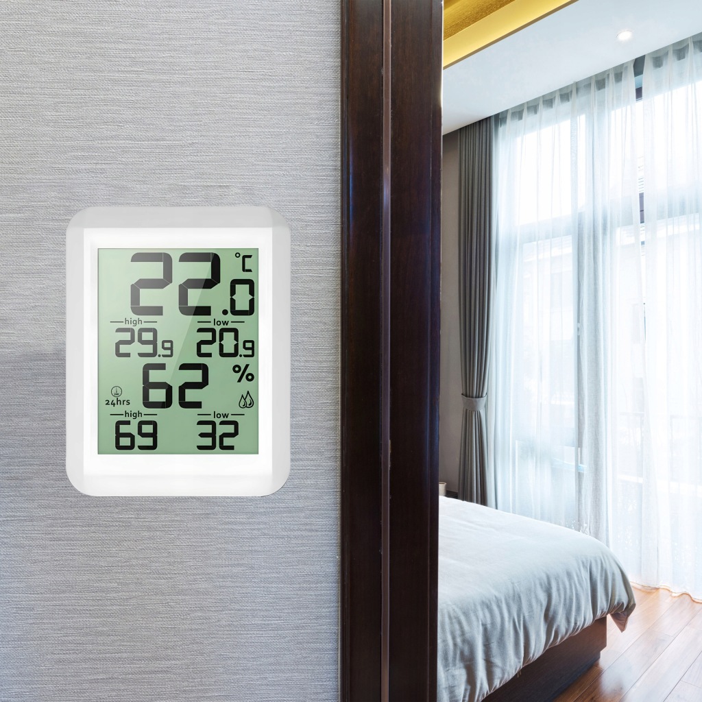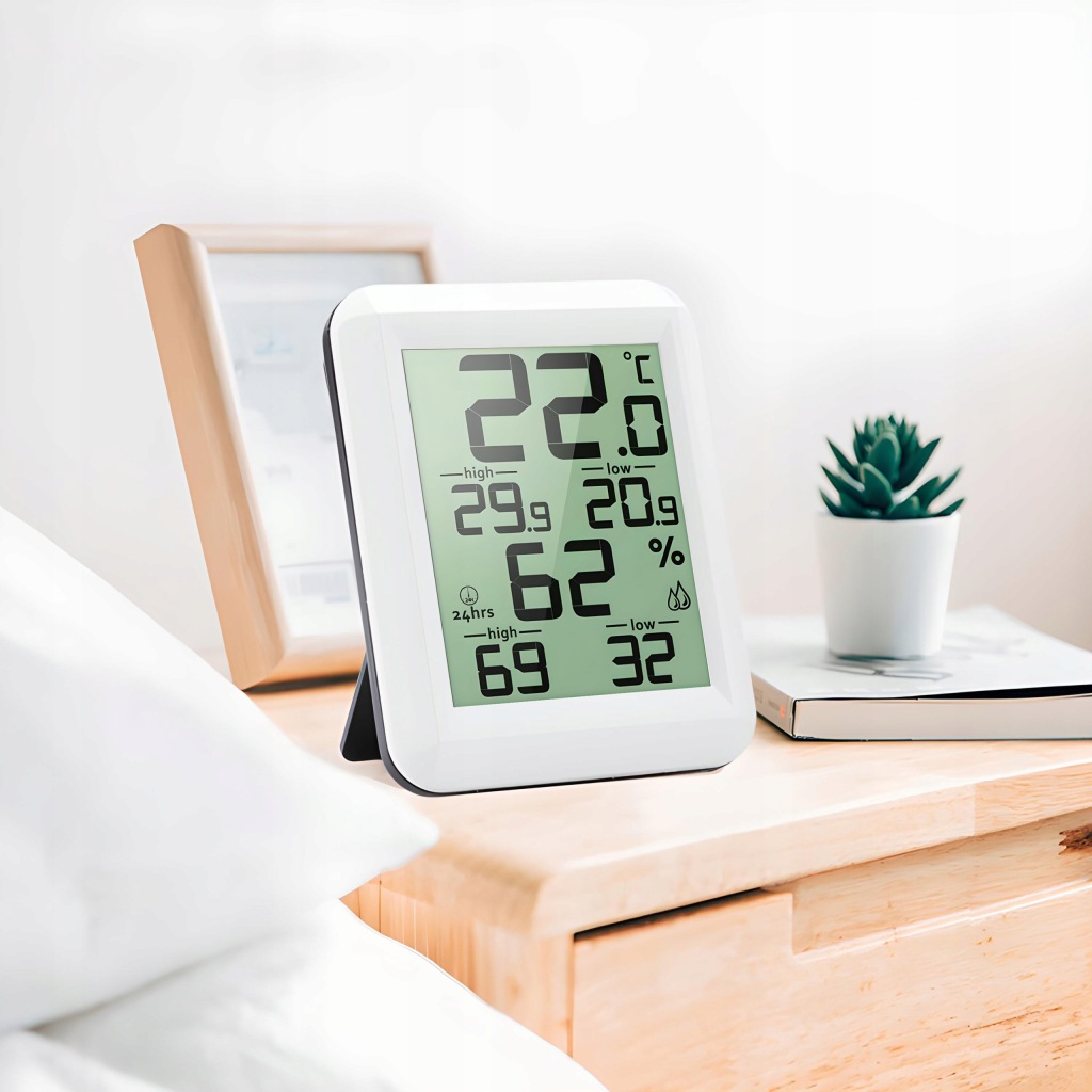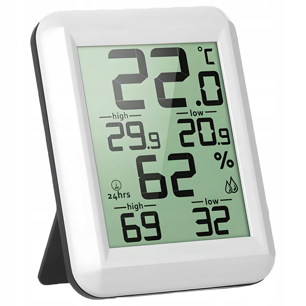 зручний прилад для щоденного контролю температури в приміщенні . Він також має додаткові функції вимірювання вологості .продукт оснащений зручним для читання РК-дисплеєм . Виготовлений із пластику білого кольору, підходить для інтерʼєрів з різною колірною гамою.