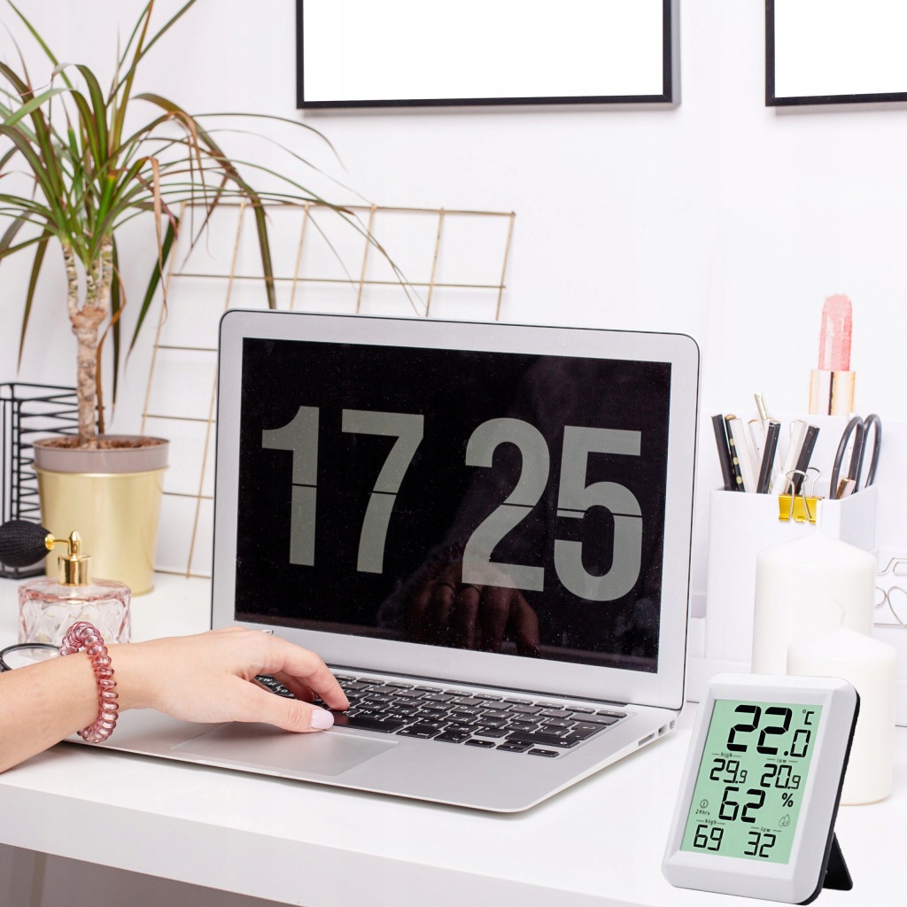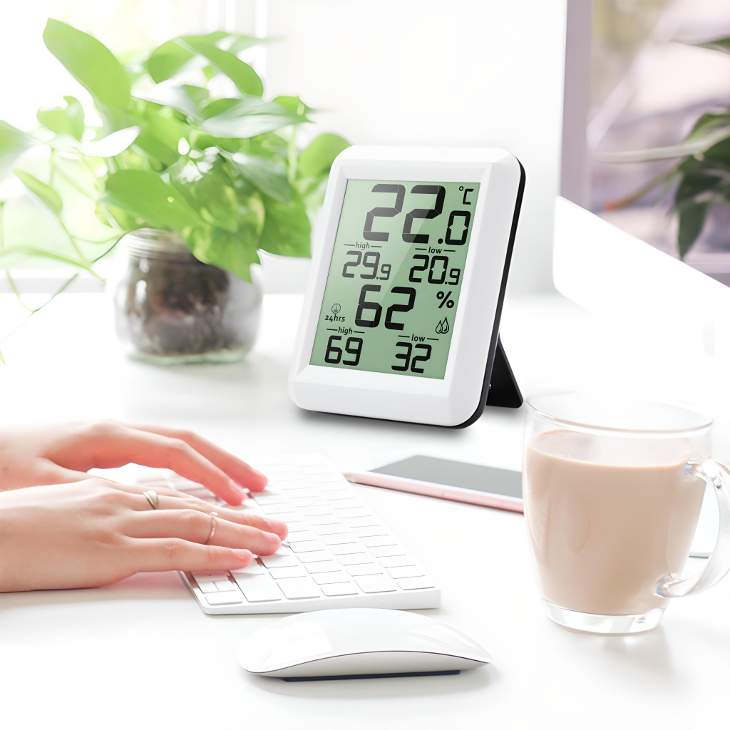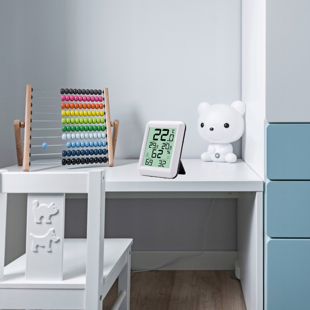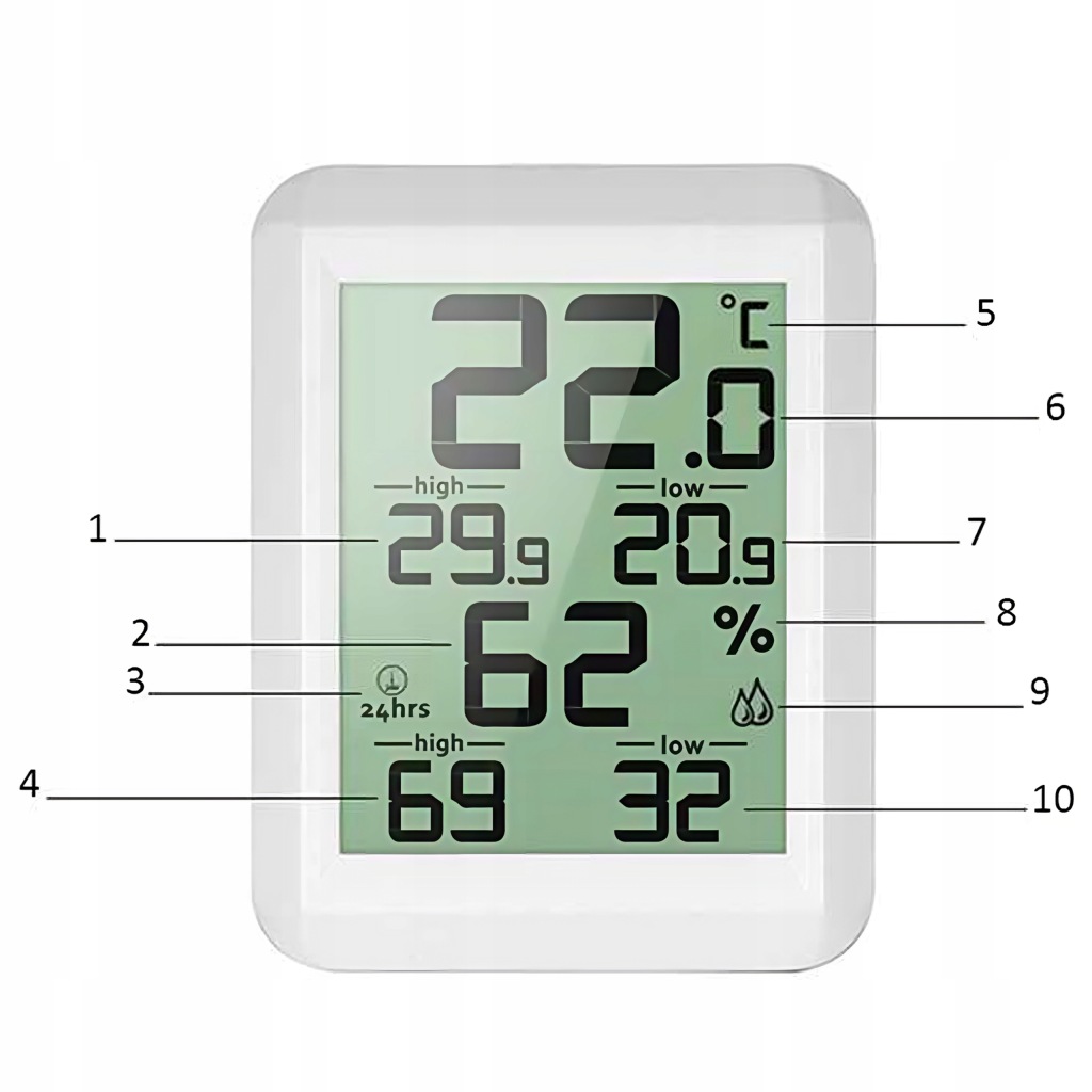 зручний прилад для щоденного контролю температури в приміщенні . Він також має додаткові функції вимірювання вологості .продукт оснащений зручним для читання РК-дисплеєм . Виготовлений із пластику білого кольору, підходить для інтерʼєрів з різною колірною гамою.