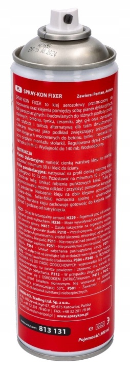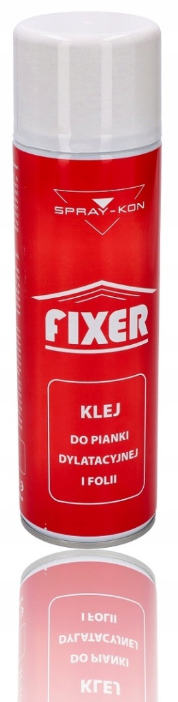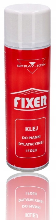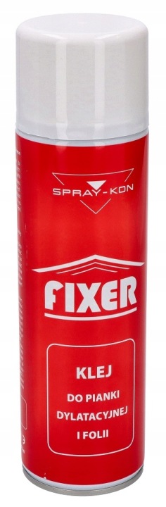 SPRAY-KON FIXER-це аерозольний клей, призначений для фіксації і склеювання між собою: компенсаційних пінопластів, пароізоляційних і будівельних плівок для різних підстав: сталевих профілів, бетону, штукатурки, кераміки, плит g-k і пінополістиролу. Це швидша і дешевша альтернатива двостороннім стрічкам. Рекомендується також в якості грунтовки для збільшення адгезії клейких стрічок, прикріплених до бетону, штукатурки і кераміці (наприклад, при теплій установці столярних виробів).