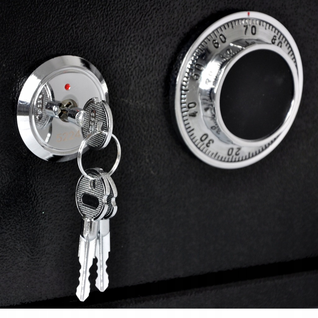 - У комплект входять: 3 ключа, кріпильні гвинти, інструкція з експлуатації. Сейф оснащений кодовим і ключовим замком.