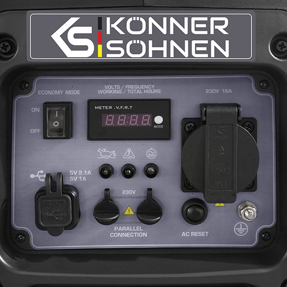генератор електроенергії Könner & amp; Söhnen KS2000iS-це відносно невеликий і легкий прилад. Номінальна потужність генерованої енергії становить 1,8 кВт / 1,8 Ква, а максимальна потужність-2,0 кВт / 2,0 ква. Агрегат оснащений двигуном з верхнім клапаном OHV потужністю 2,5 к.с., який пройшов багатогодинні і багаторівневі випробування. Цей двигун є дуже міцним і економічним пристроєм, що дозволяє продовжити термін служби. KS2000i-s оснащений безшумним корпусом для підвищення зручності використання, а також 5-літровим паливним баком, який (при ~50% навантаження) забезпечує майже 6 з половиною годин роботи без заправки. Агрегат може працювати в економічному режимі, в якому обороти двигуна регулюються під навантаження. Агрегат має 1 розʼєм 16 А / 230 В і 2 розʼєми USB. Машина також має розʼєм, що дозволяє паралельно підключати агрегати за допомогою додаткового проводу до коробки.
