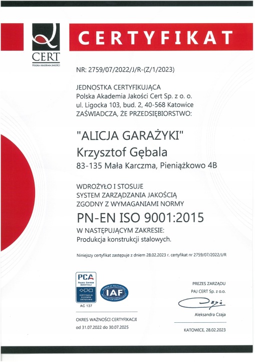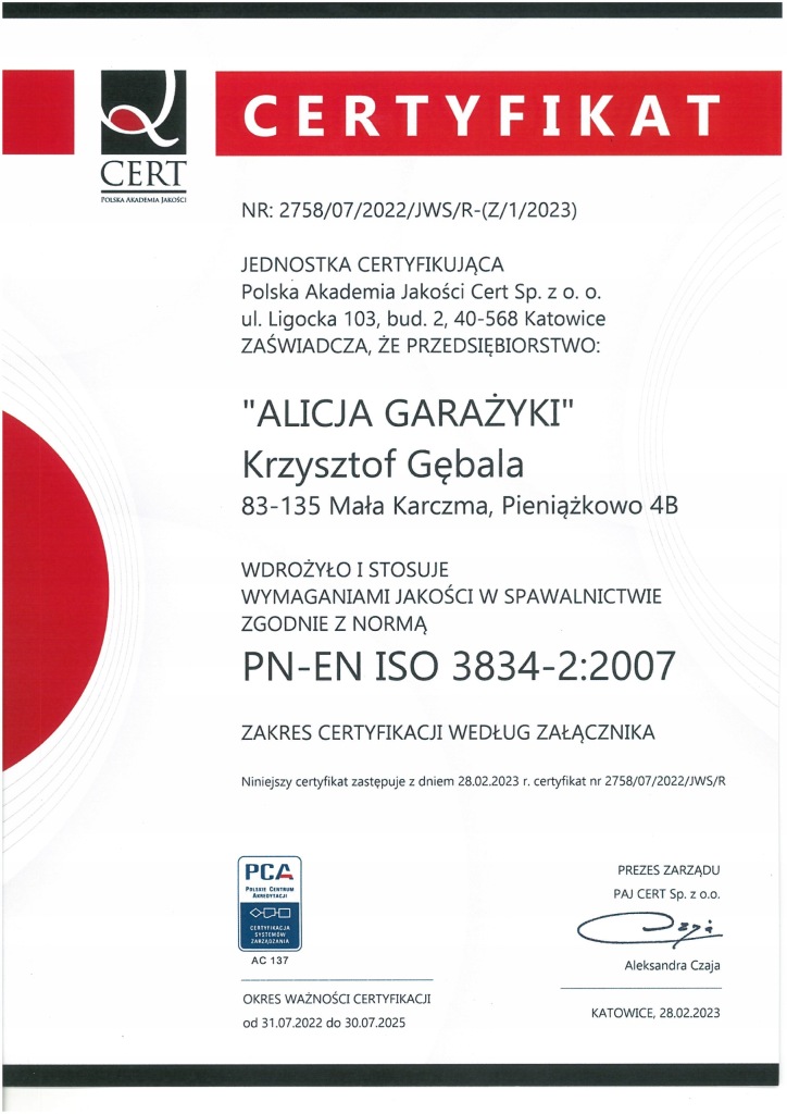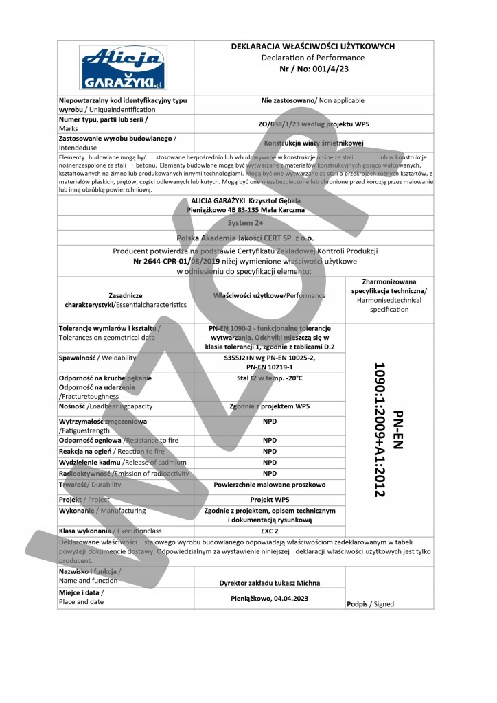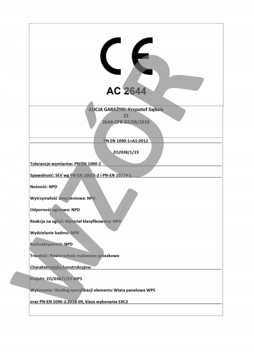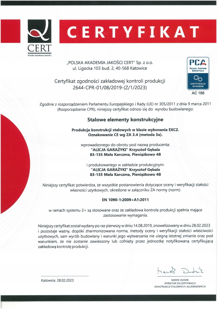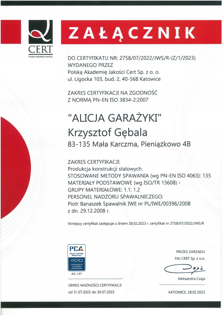 сталева конструкція, виготовлена з куточка і швелера, зʼєднується методом зварювання за стандартом PN EN 1090-1+A1:2012 І класу виконання EXC2.