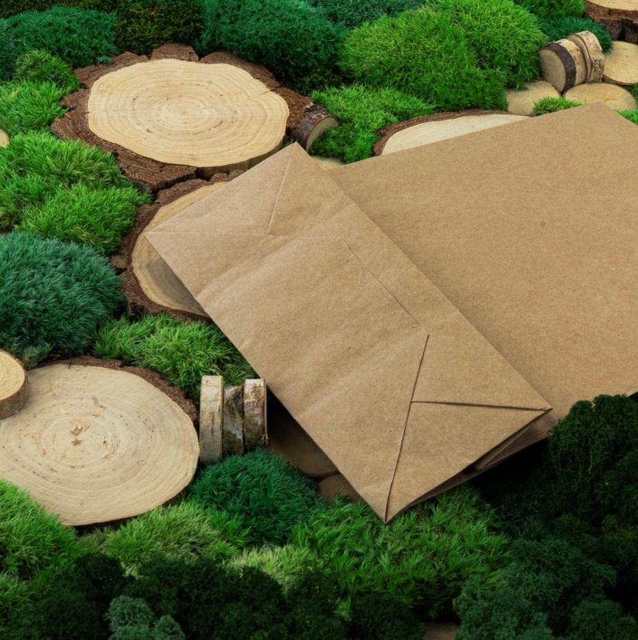 паперові пакети з плоскою ручкою виготовлені з коричневого крафт-паперу, ручки для сумок склеєні всередині сумок.