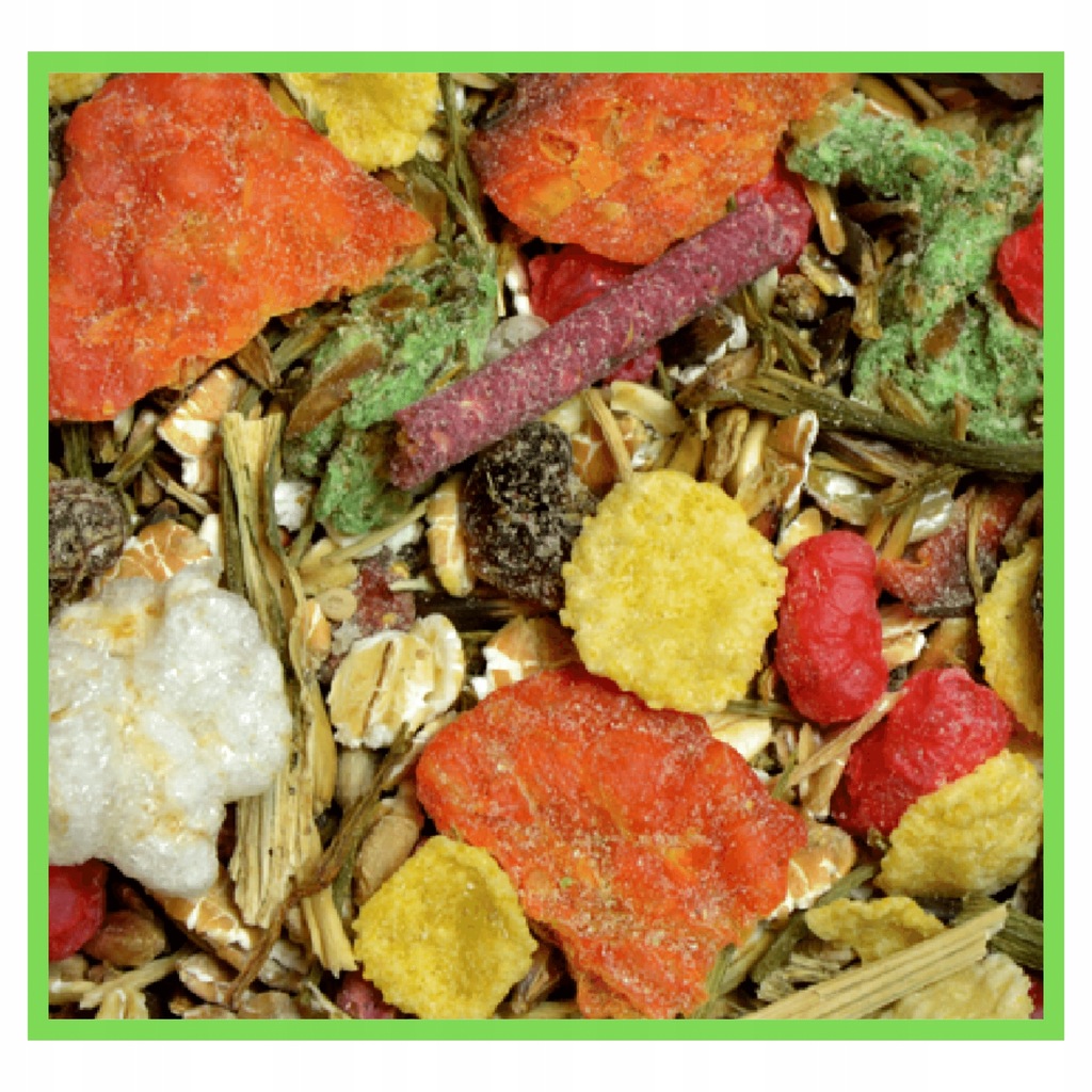 склад:вівсяні пластівці, мюслі,фруктові гранули, гранули люцерни і сіна, пшениця, селера, петрушка, кріп, овес, екструдовані Кукурудзяні і пшеничні чіпси, рис, чорний і білий Соняшник, горіхи, персик, морква, буряк, абрикос, родзинки, яблуко, банан, лляне насіння, Кукурудза, ріжкове дерево