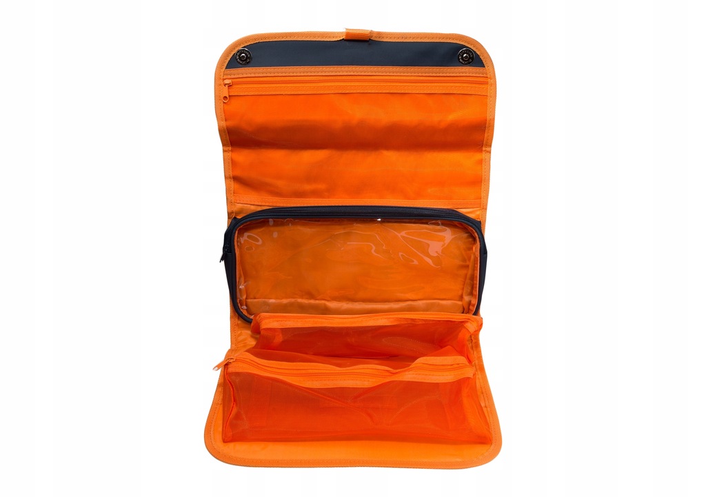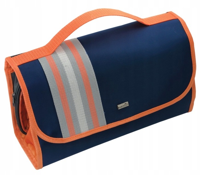 Виготовлений з водонепроникного матеріалу темно-синього кольору з помаранчевою обробкою.