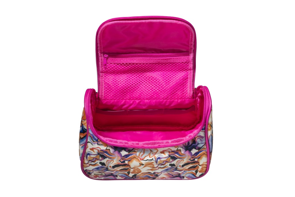 Інтерʼєр косметички оброблений дуже акуратно підкладкою яскраво-рожевого кольору.