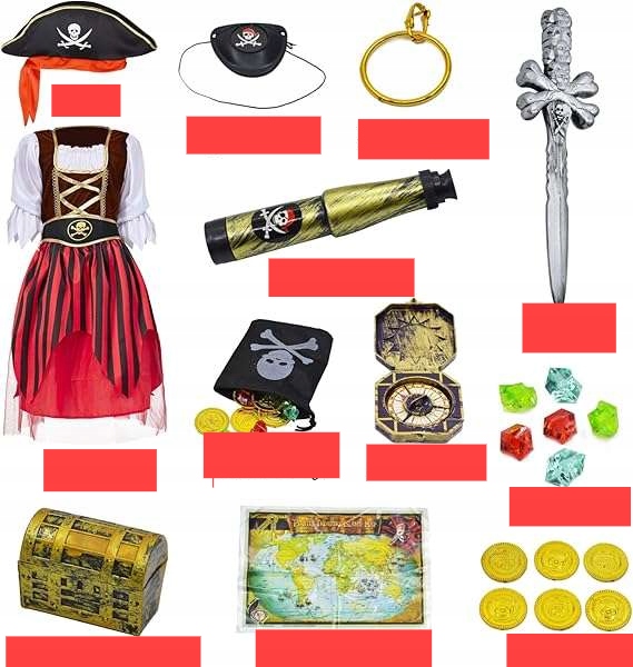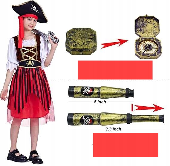 - наш піратський костюм включає в себе плаття, капелюх і безліч іграшок, таких як карта, компас, телескоп, іграшковий ніж і так далі.
