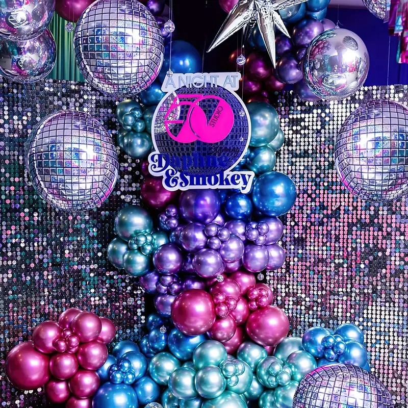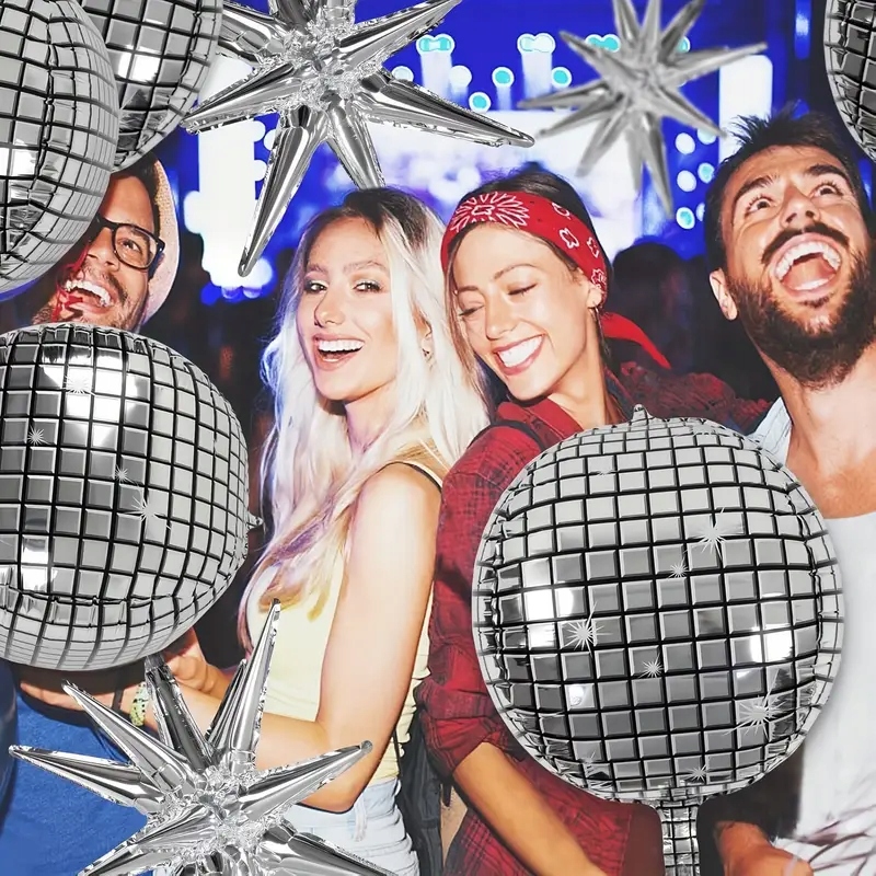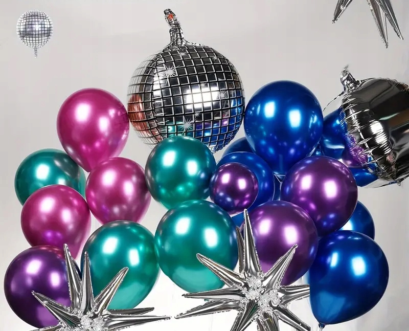- кольори диско: срібні та хромовані кольорові повітряні кулі створюють елегантну атмосферу Нового року.