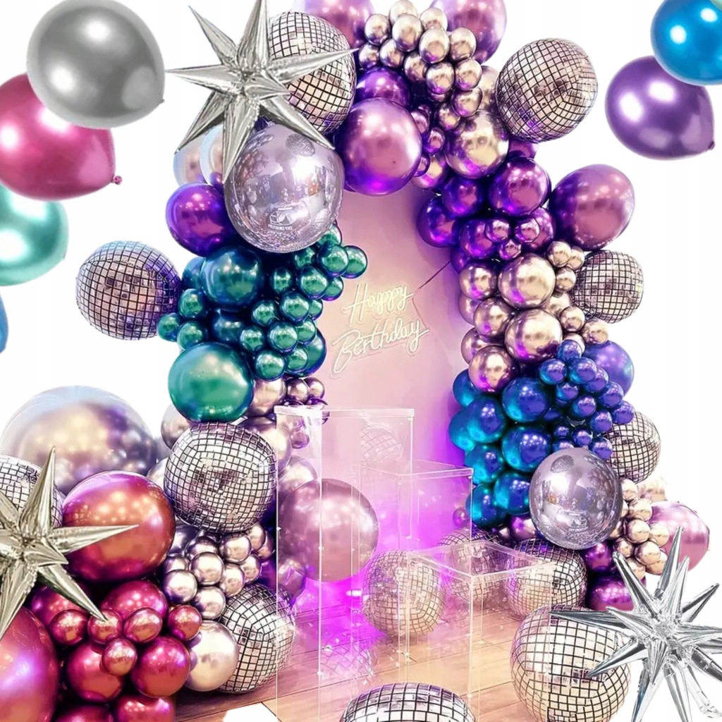 чудова гірлянда з повітряних куль в елегантному поєднанні срібних і кольорових хромованих повітряних куль - відмінний вибір для карнавалу і ночі, повної чарівництва. Повітряні кулі різних розмірів створюють згуртоване, ефектне прикраса, яке додасть класності і стилю будь-якого інтерʼєру. Це незабутнє прикраса, яке підкреслить урочистий характер вашого заходу і додасть йому неповторний блиск.