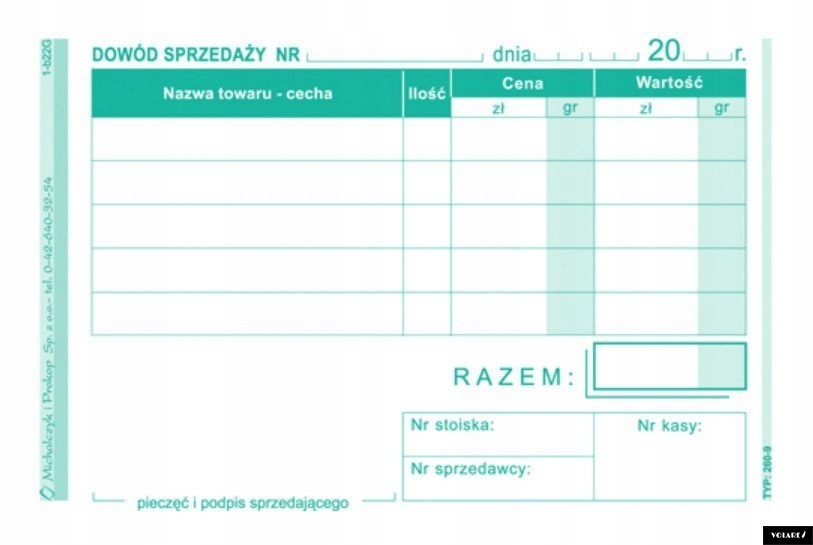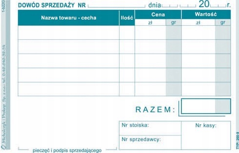260-9 підтвердження продажу (квитанція) формат: A7 тип паперу: самовідновлюється застосування: квитанції та інші свідоцтва про продаж палітурка: блок 80 аркушів друк: одностороння (мультикопія)