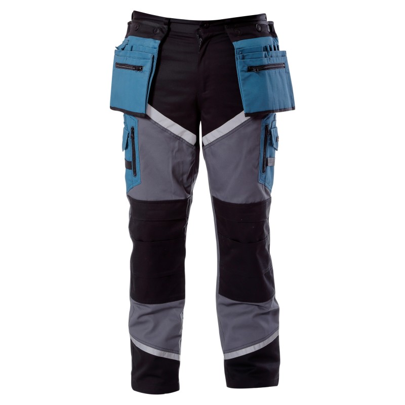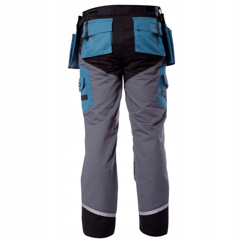 - робочі штани для талії Виготовлені з матеріалу вагою 270 г/м2 (35% бавовни, 65% поліестеру) в чорно-сіро-бірюзовому кольорі зі світловідбиваючими смугами для поліпшення видимості працівника під час роботи.