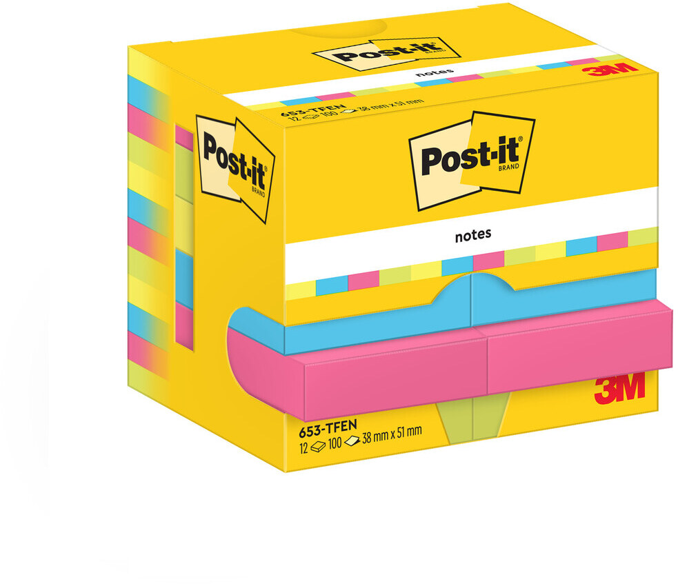 - упаковка містить 12 блоків по 100 заміток розміром 38 x 51 мм в енергійних кольорах.