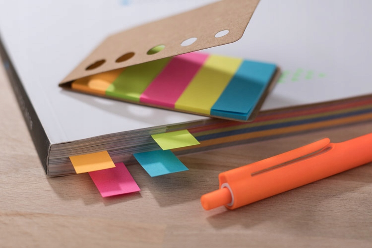 липкі замітки пʼяти кольорів, поміщені в екологічно чисту обкладинку - дуже корисний і привабливий гаджет.