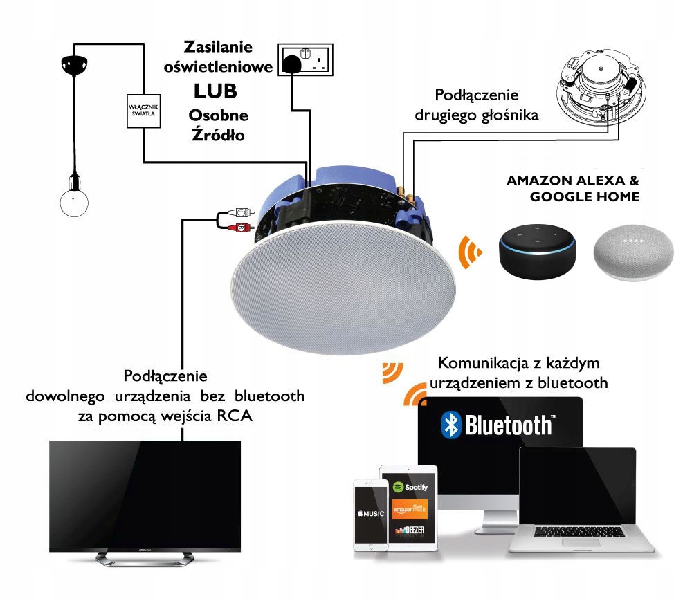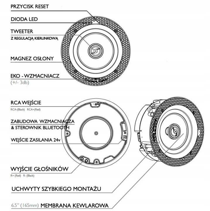 ці дивовижні бездротові колонки сильно відрізняються від продуктів, доступних в даний час в цьому секторі. Динаміки являють собою повністю інтегроване аудіо-рішення " All In One", що означає, що, на відміну від інших відомих бездротових звукових систем, їх не потрібно підключати до окремого підсилювача. динаміки забезпечують відмінну якість звуку, прості в установці. Вони доступні у версії з одним динаміком bluetooth або парою (пропонується на цьому аукціоні).. Розроблено командою інженерів, що спеціалізуються на продуктах з області так званого розумного будинку. Без каркасні динаміки тільки 3 мм стирчать зі стелі і розумна магнітна кришка гриля може бути швидко розібрана для очищення або заміни на інший колір