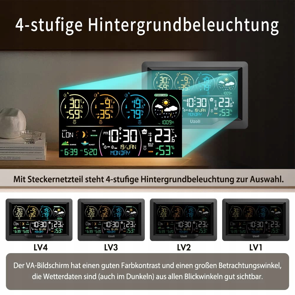 метеостанція Uzoli має 3 зовнішніх датчика температури і вологості, які широко підготовлені для спостереження за поточними погодними умовами не тільки у вітальні, дитячій кімнаті, спальні, кухні, теплиці і саду, але і в офісі, конференц-залі, на балконі/задньому дворі або в будь-якому місці в межах 60 м від базової станції.
