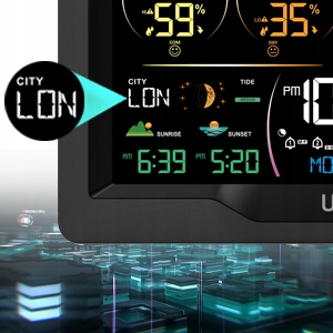 метеостанція EM3390 оснащена ефективним РК-екраном VA-LCD для відображення всіх даних про погоду, таких як поточні дані про температуру і вологість в 4 місцях, час і дата, тиск повітря, прогноз погоди на наступні 12 годин, час сходу і заходу сонця, фаза Місяця, припливи, нестандартне місто, рівень комфорту цвілі в приміщенні. Цей монітор з термометром і гігрометром відображає щоденні максимальні і мінімальні значення температури і вологості повітря, а також може встановлювати два будильника з часом повтору 5-60 хвилин, будильник температури і вологості повітря і автоматичний нічний режим.