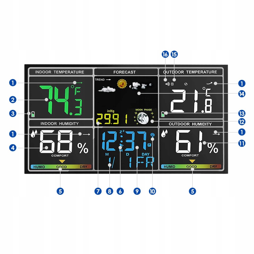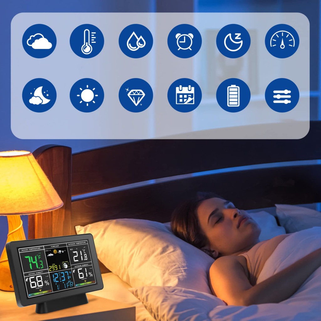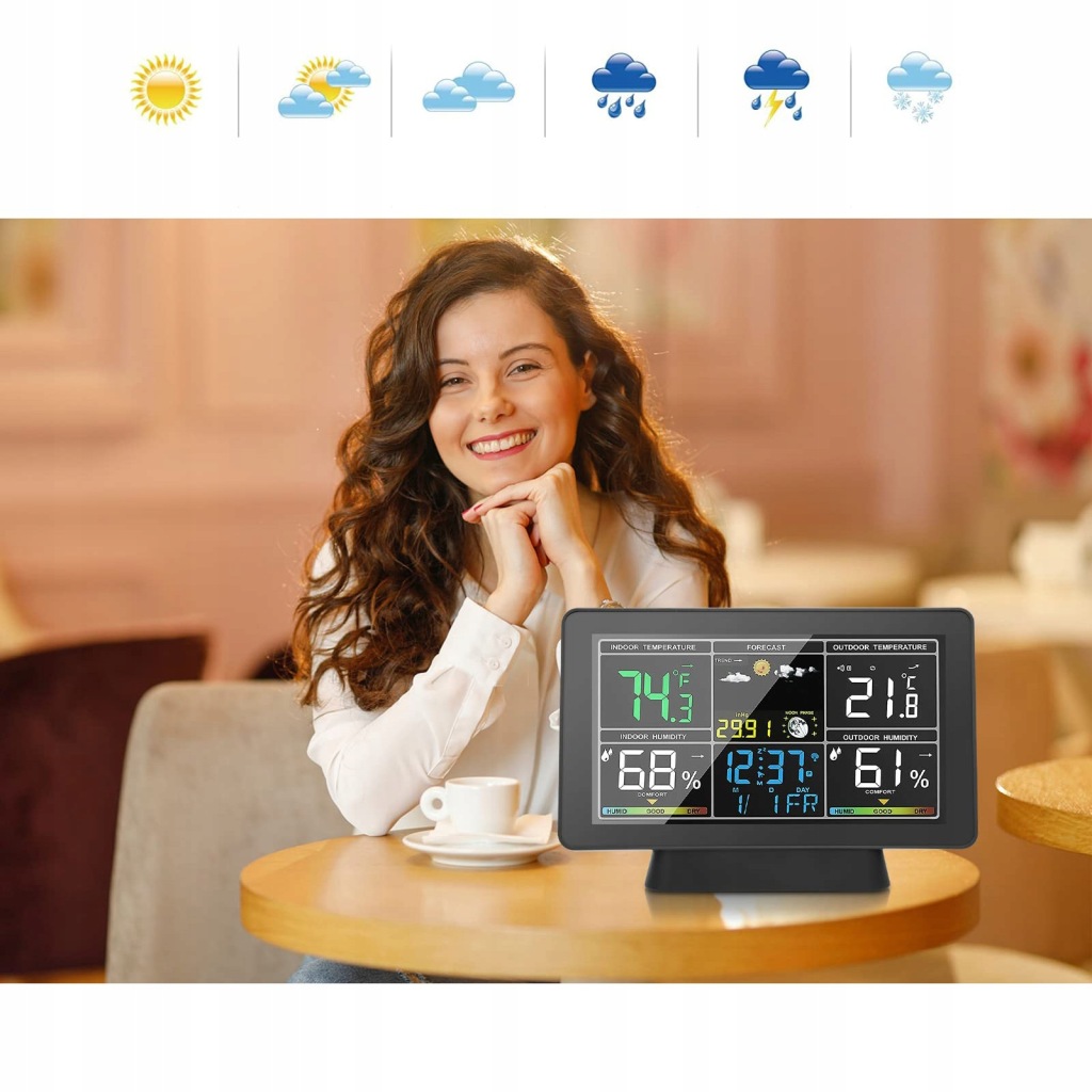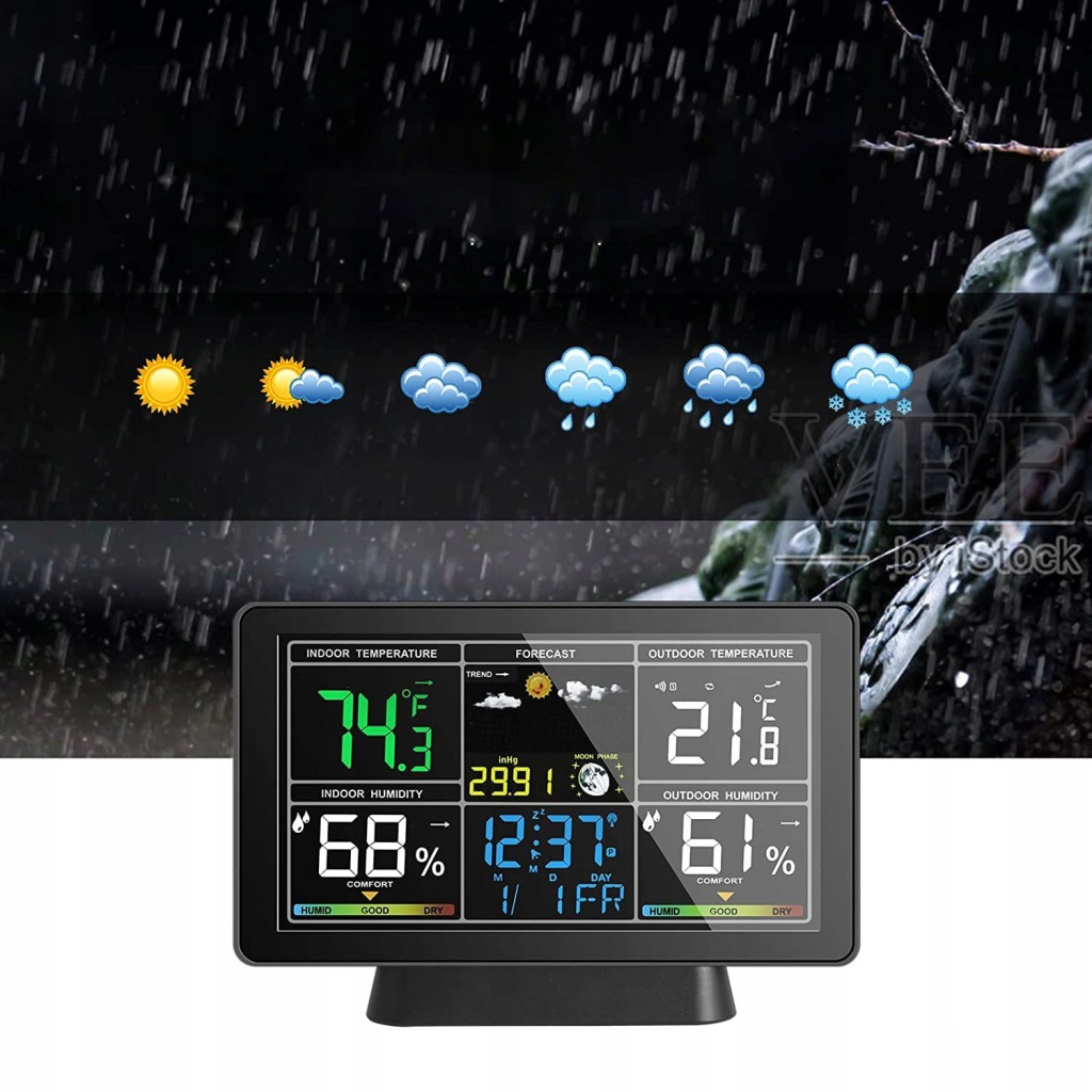 ✅механічні погодні Годинники: ця метеостанція відображає безліч інформації, включаючи (12h24h), дату, тиждень, температуру (від ℃ до℉), А також вологість, фазу, прогноз погоди і індикатор атмосферного тиску, щоб ви могли бути в курсі навколишнього середовища і погоди.