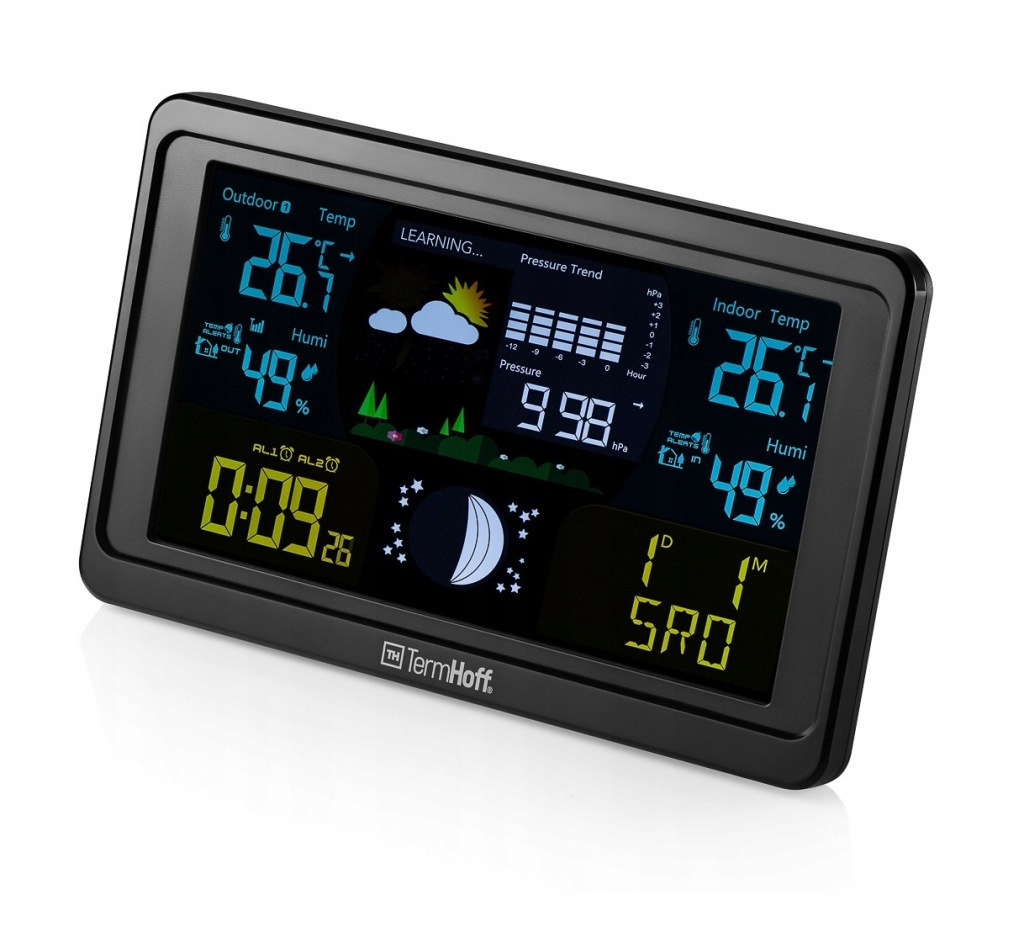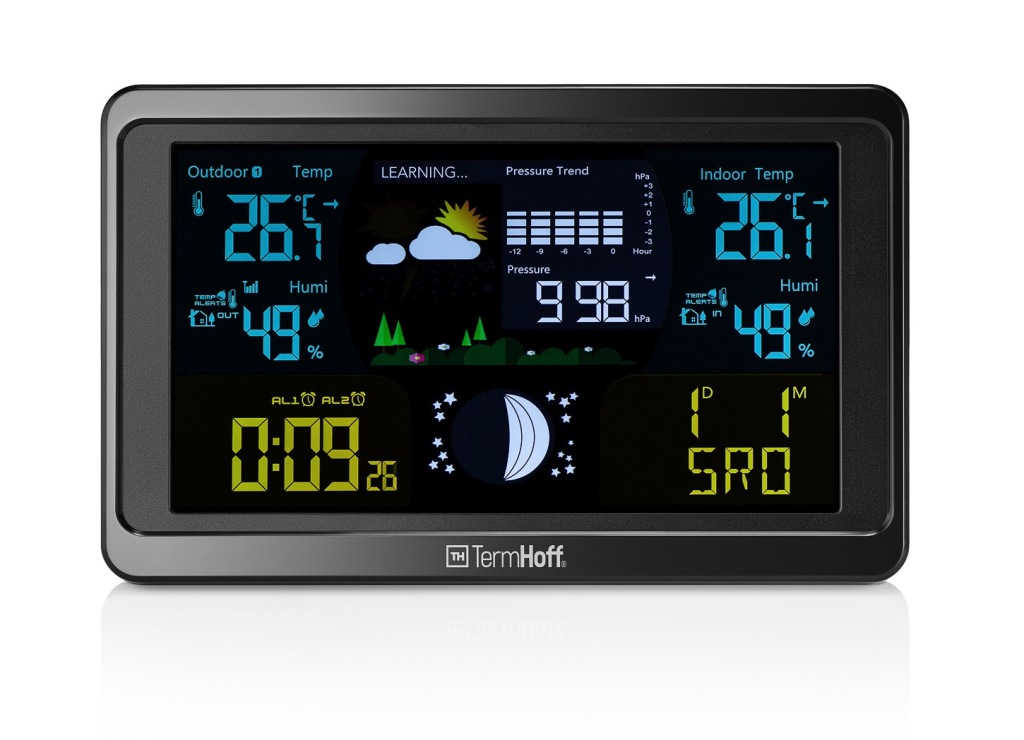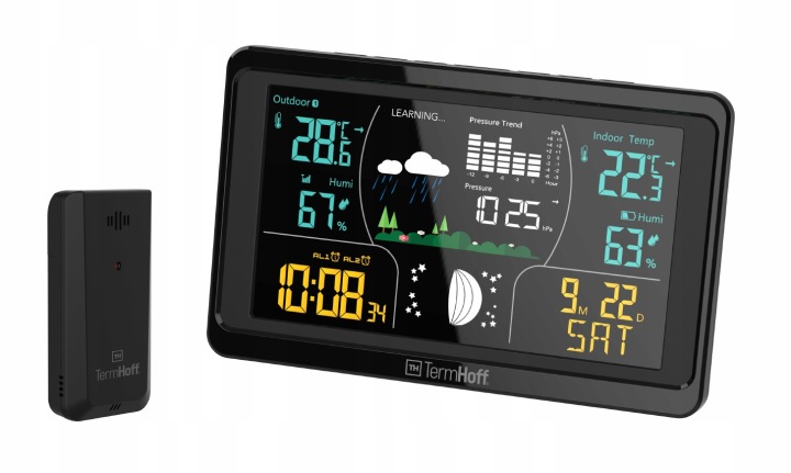 багатофункціональна бездротова метеостанція thermhoff th-WS3 з функцією попередження про погоду: вимірює внутрішню і зовнішню температуру і прогнозує місцевий прогноз погоди, що робить його ідеальним вибором для отримання точних вимірювань. Пристрій має гладкий, легко читається дисплей з комплексними даними про температуру, вологість і прогнозі.