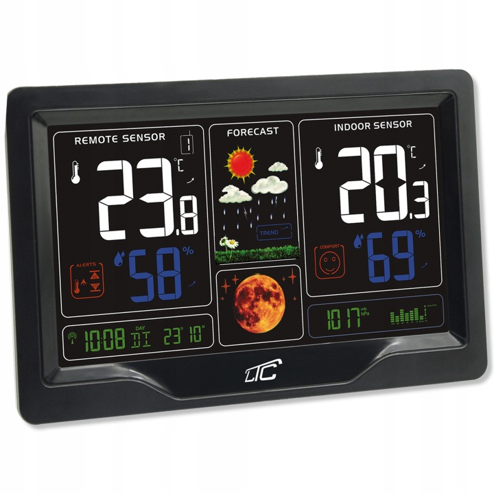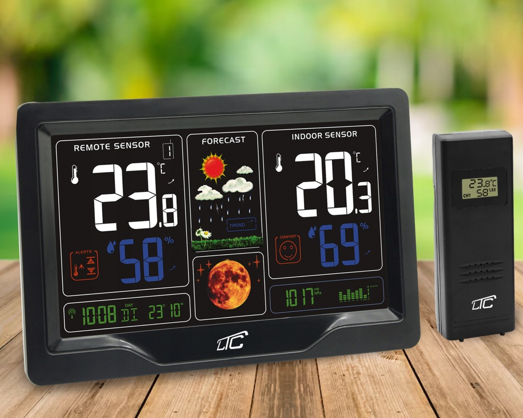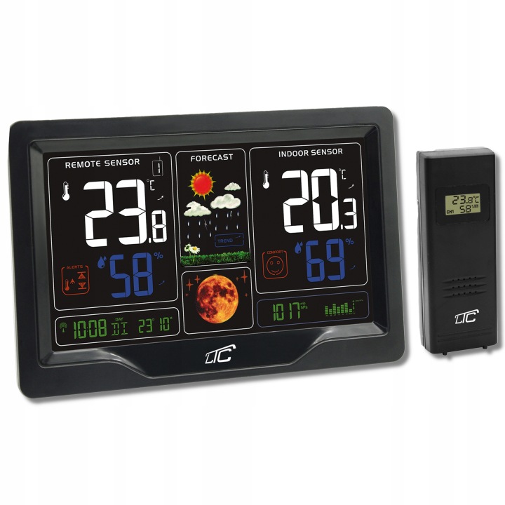 метеостанція LTC також надзвичайно універсальна. Ви можете використовувати його в якості будильника, повтору або навіть відображення фази Місяця! Його великий кольоровий дисплей легко читається навіть на відстані.
