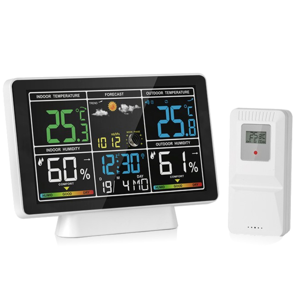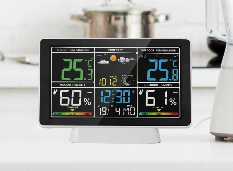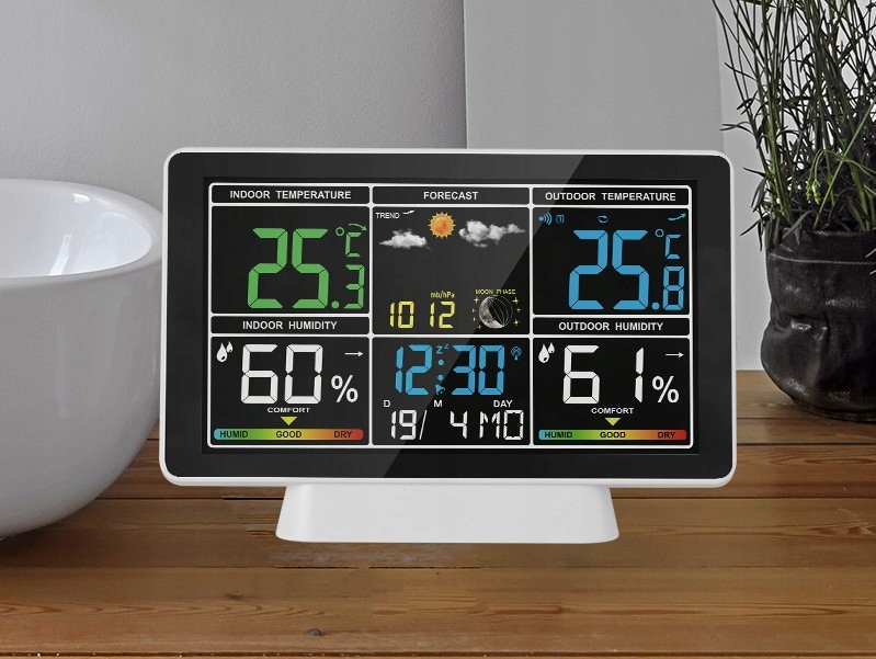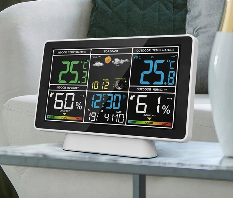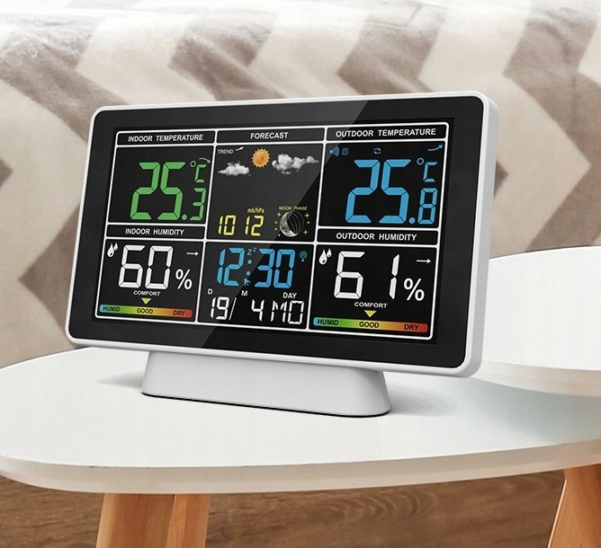 метеостанція-це пристрій, який показує температуру і вологість в приміщенні і на вулиці. Він також відображає час, дату, висотатиску, фази місяця і прогноз погоди . Сучасний дизайн цієї станції зробить ваш інтерʼєр більш привабливим.