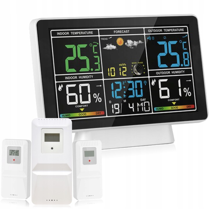 метеостанція, оснащена 3 датчиками, дозволяє отримувати дані про погоду від 3 різних незалежних один від одного місць , віддалених від Макс.60 м від станції. Таким чином, ви можете отримати кращу і більш детальну інформацію про температуру і вологість повітря. Це особливо корисно, коли ви хочете забезпечити належні умови в різних кімнатах вашого будинку або офісу.