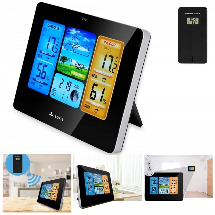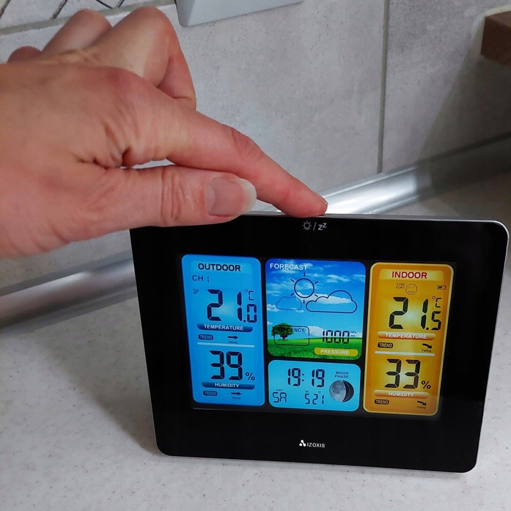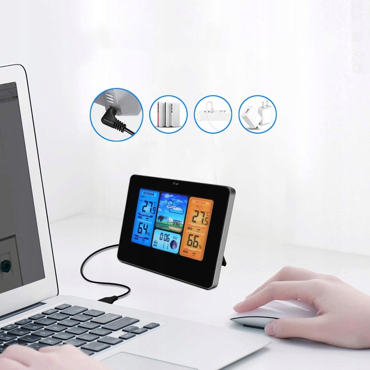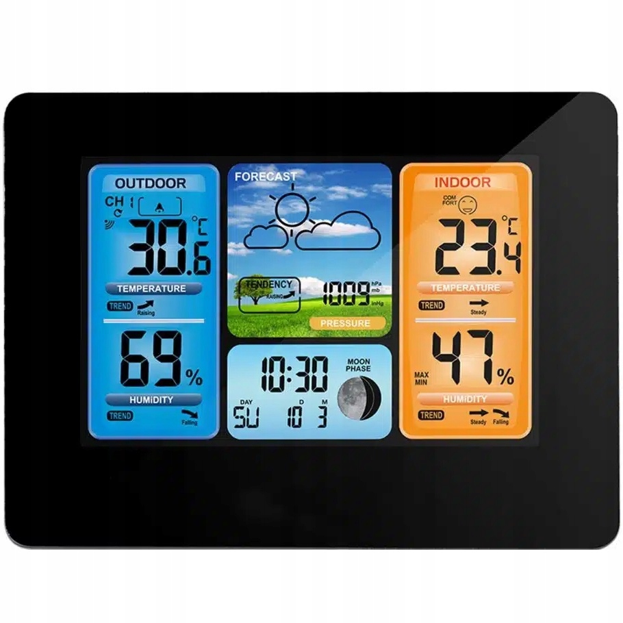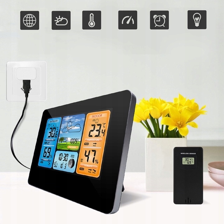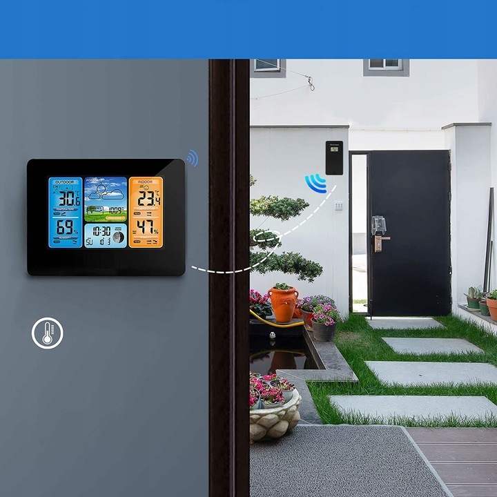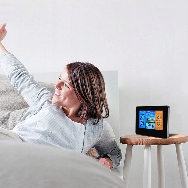 сучасна багатофункціональна метеостанція з великим і чітким РК-дисплеєм інтуїтивно зрозуміла і проста у використанні .ідеально підходить для будь-якого будинку, квартири, офісу. За допомогою підставки ви можете розмістити її в будь-якому місці, на столі, столі, холодильнику, полиці. займає мало місця і прекрасно вписується в інтерʼєр приміщень своїм тонким зовнішнім виглядом.