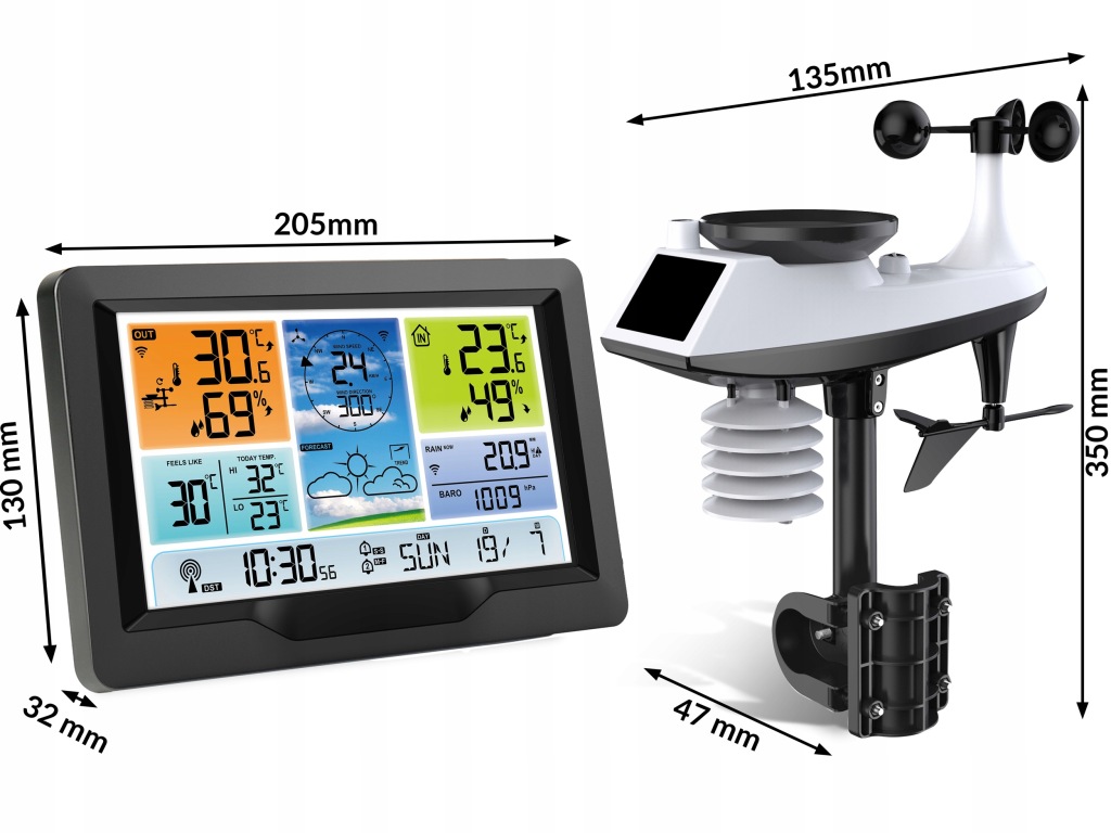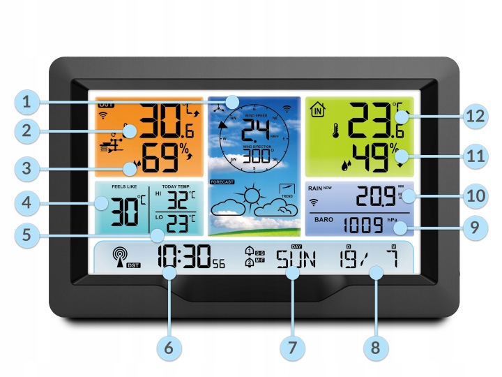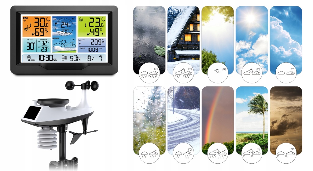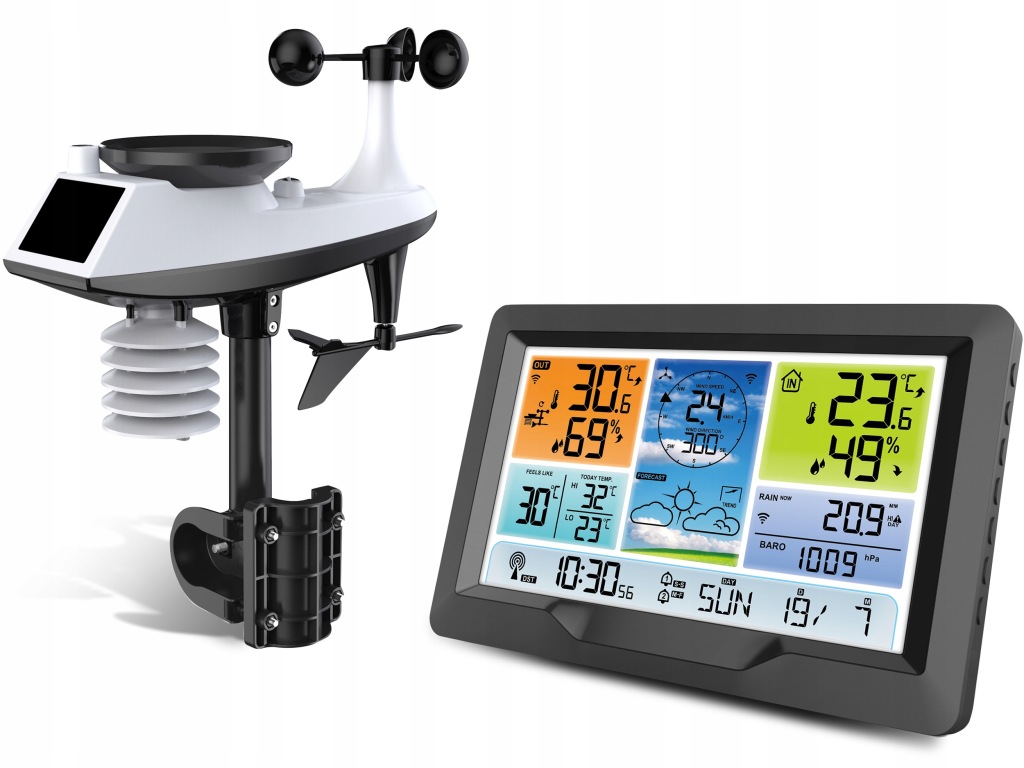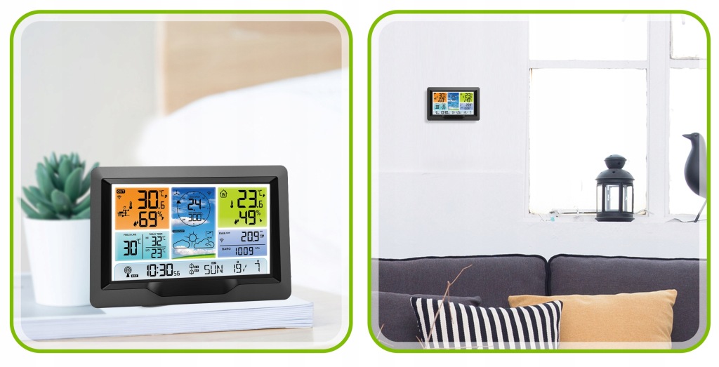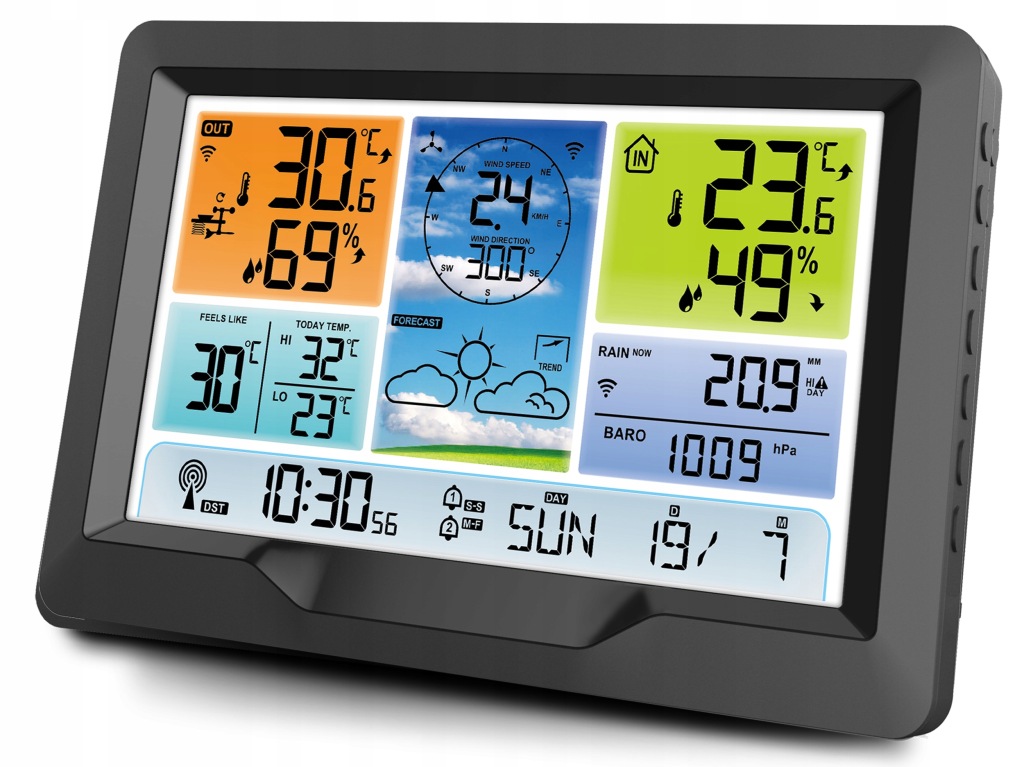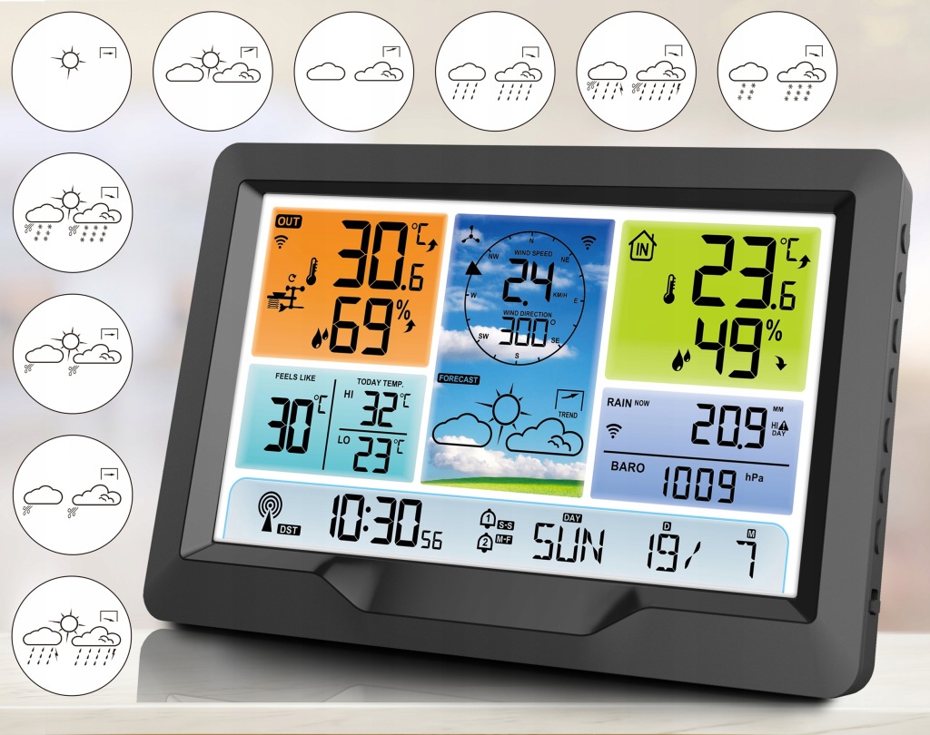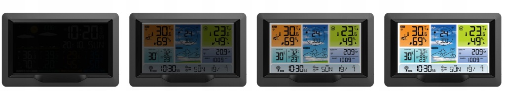 - з кольоровим дисплеєм, синхронізацією часу по сигналу DCF77 ібагатофункціональним зовнішнім датчиком .