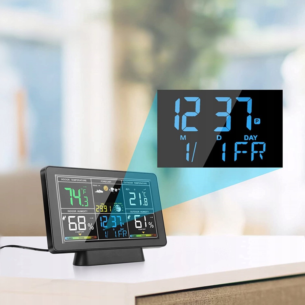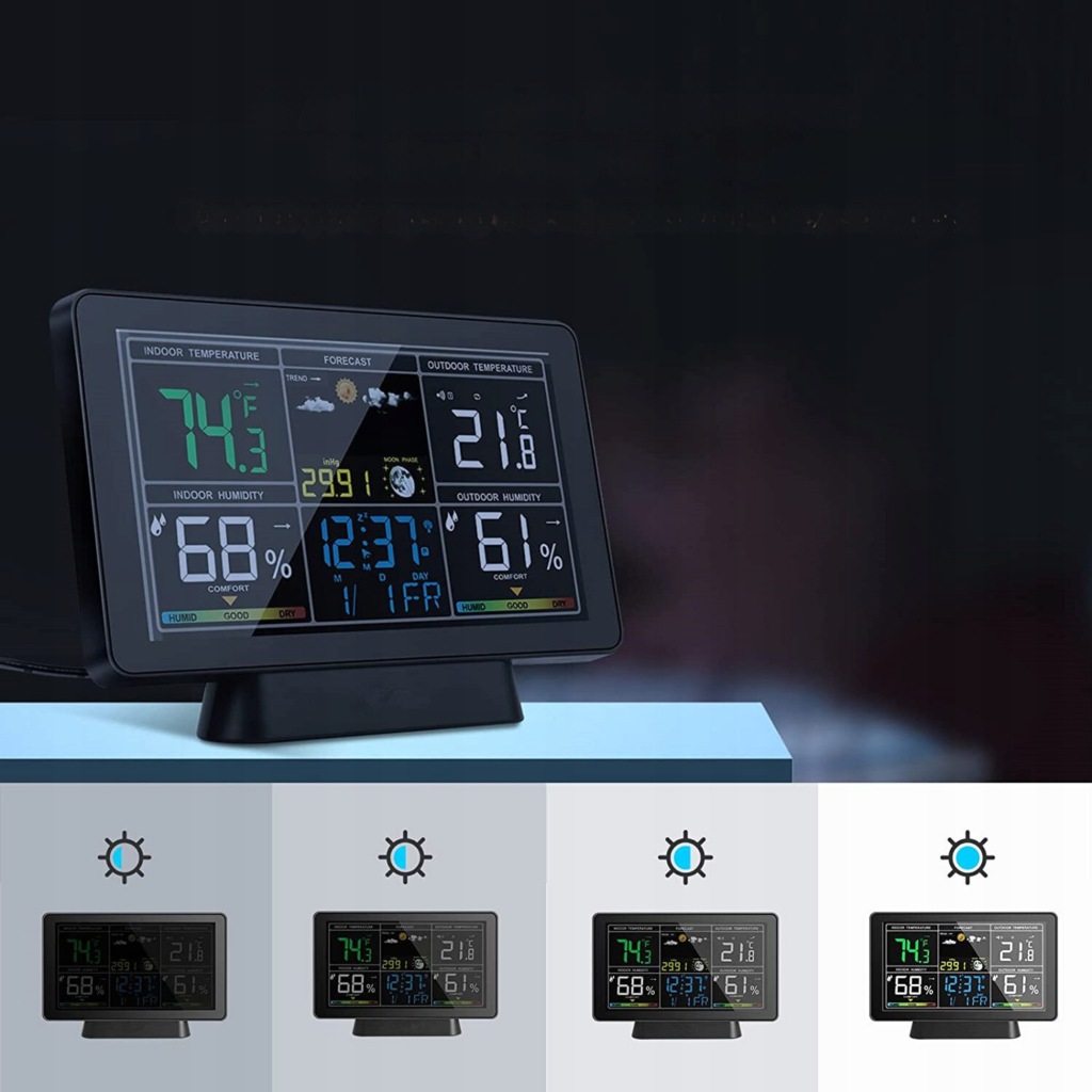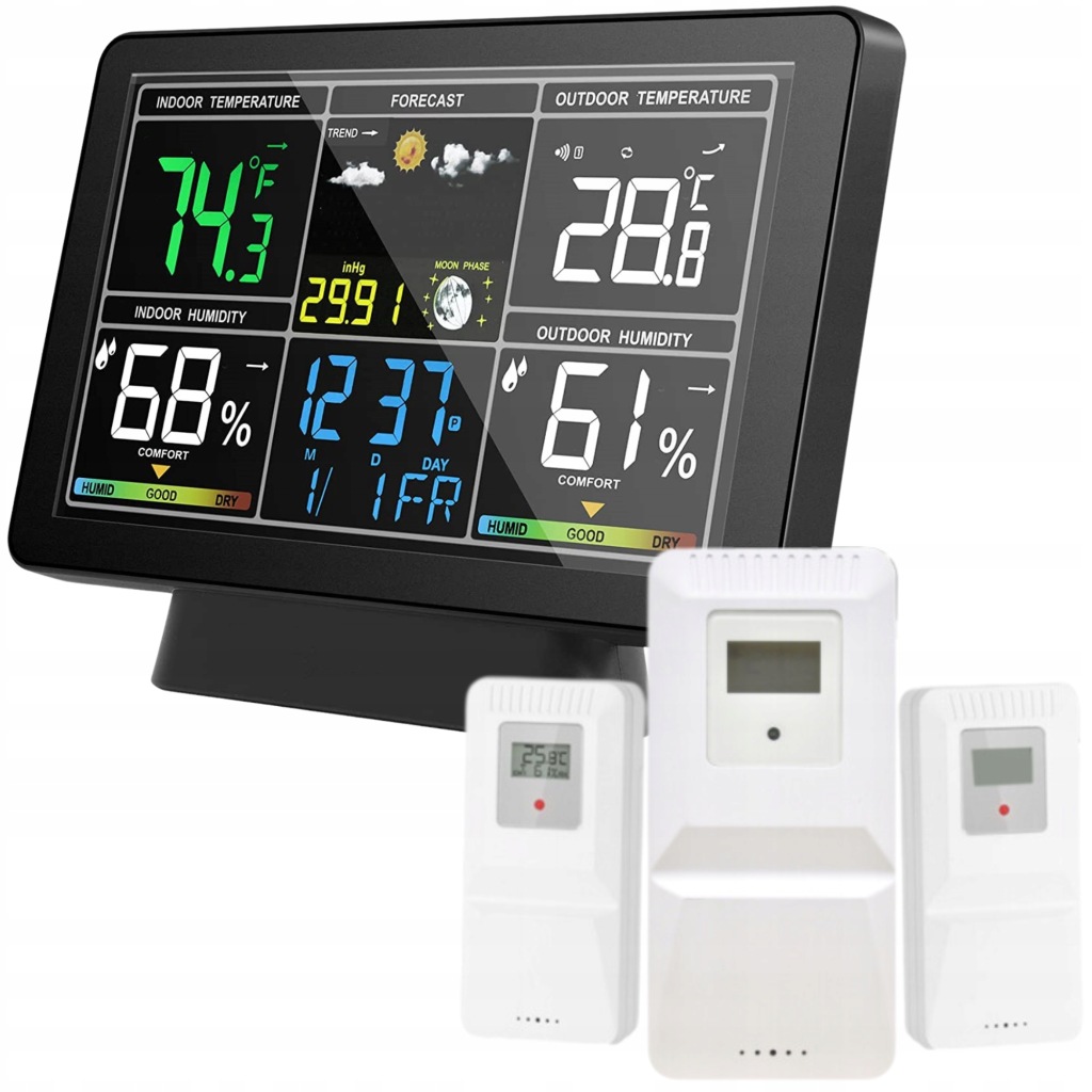 метеостанція-це пристрій, який показує температуру і вологість в приміщенні і на вулиці. Він також відображає час, дату, висотатиску, фази місяця і прогноз погоди . Сучасний дизайн цієї станції зробить ваш інтерʼєр більш привабливим.