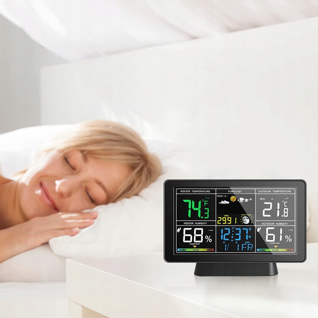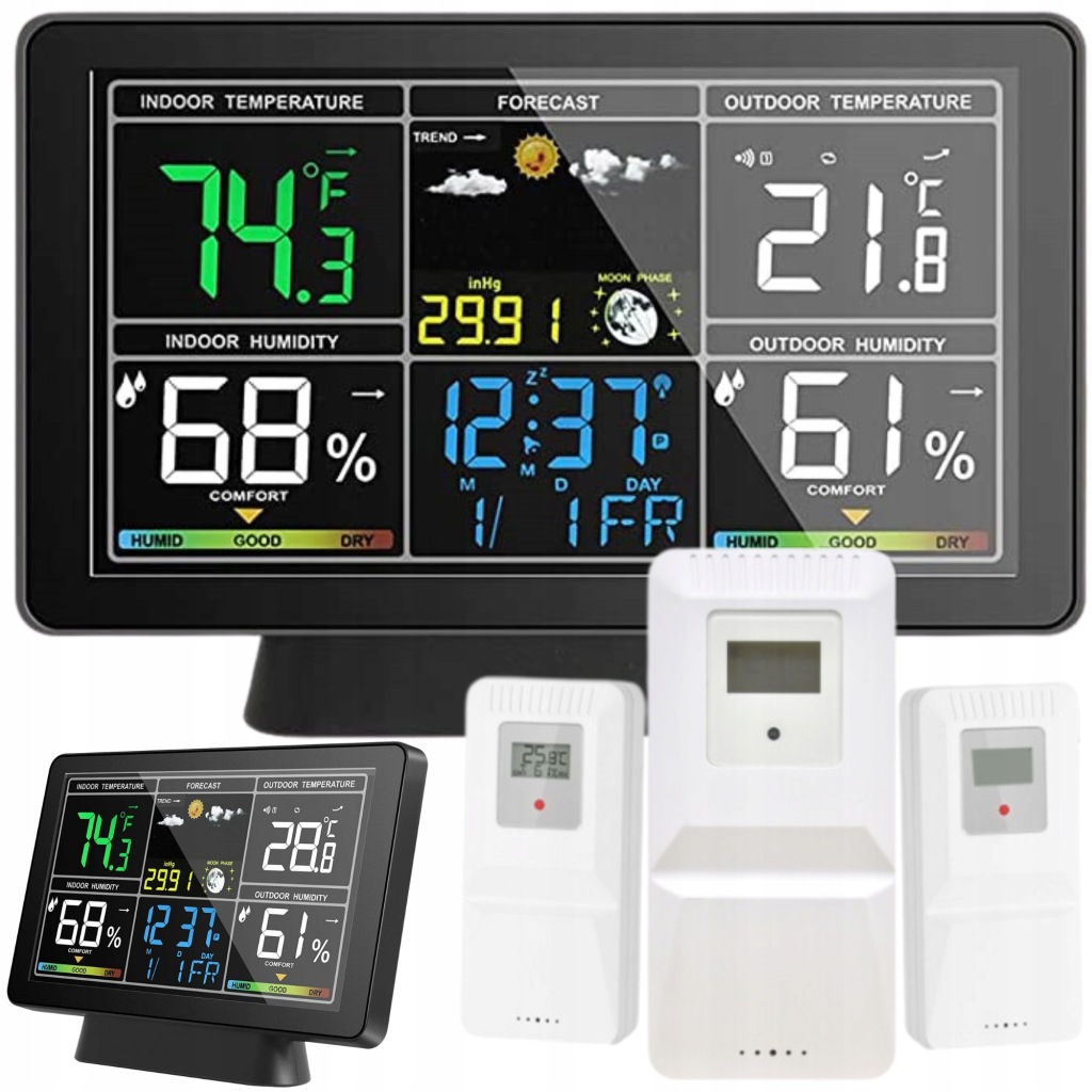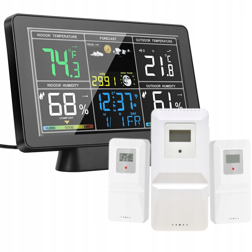 метеостанція-це пристрій, який показує температуру і вологість в приміщенні і на вулиці. Він також відображає час, дату, висотатиску, фази місяця і прогноз погоди . Сучасний дизайн цієї станції зробить ваш інтерʼєр більш привабливим.