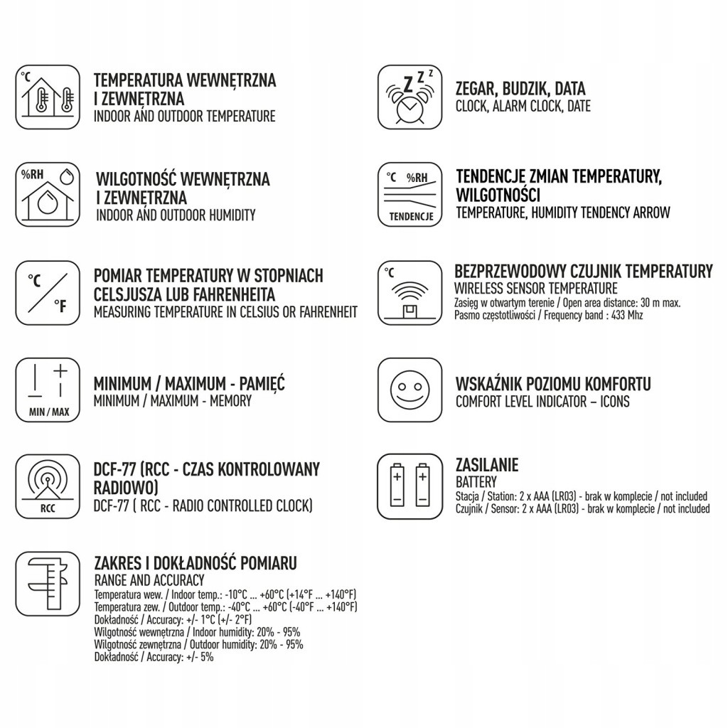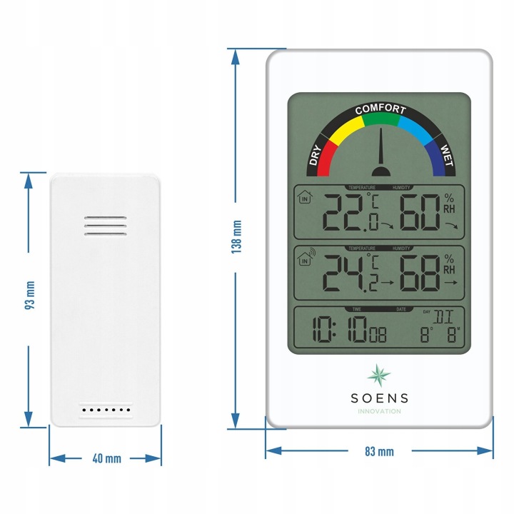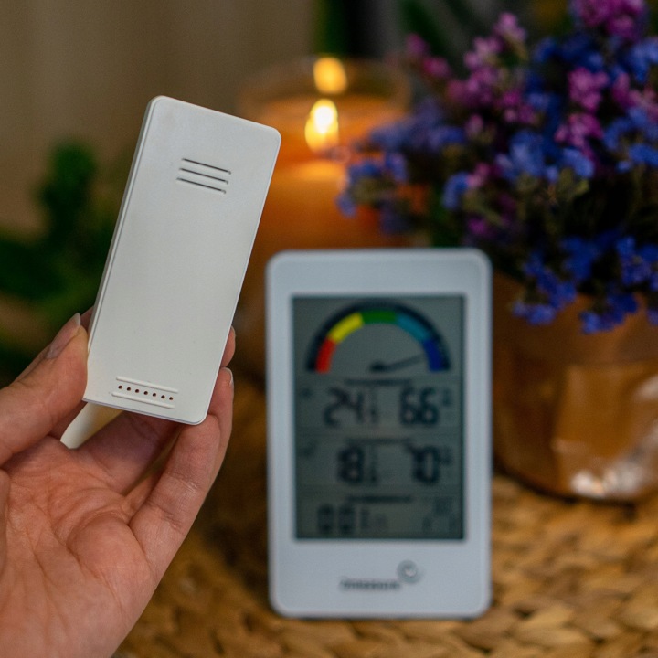 - зовні і всередині - бездротовий датчик, прикріплений до станції, дозволяє збирати вимірювання температури і вологості зовнішнього повітря, передаючи його на відстань прибл. 60 метрів!