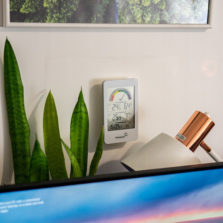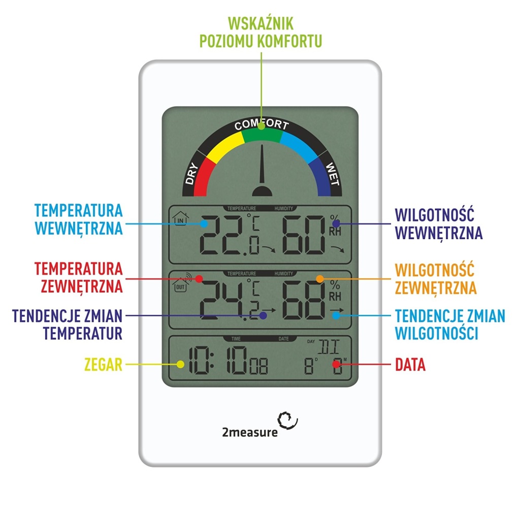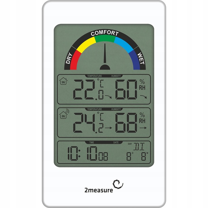 - пʼятирівневий кольоровий індикатор комфорту - легко читається індикатор допоможе вам визначити умови в квартирі (в масштабі: дуже сухо, сухо, комфортно, волого і дуже волого)