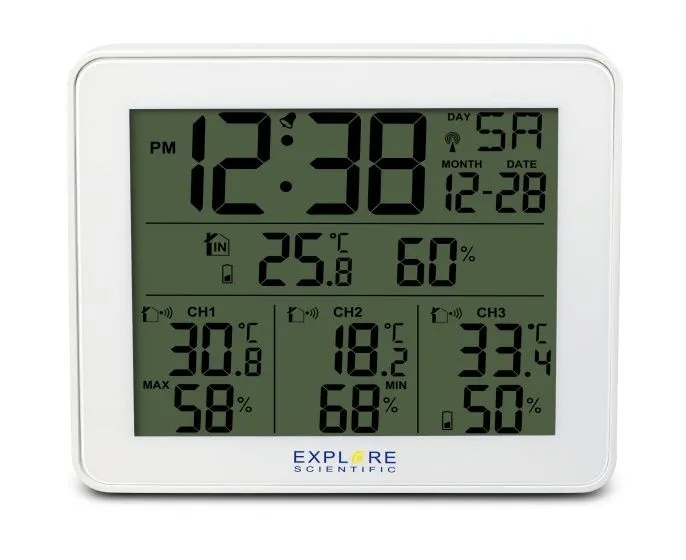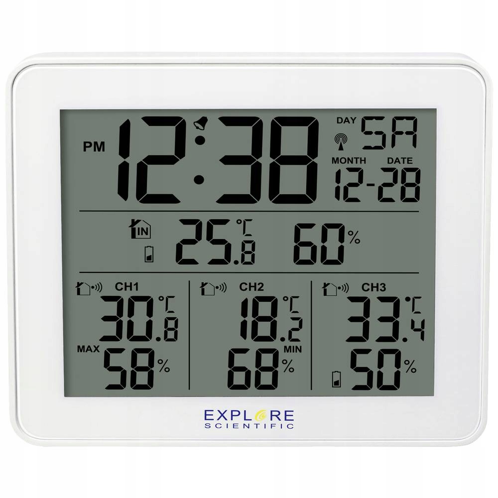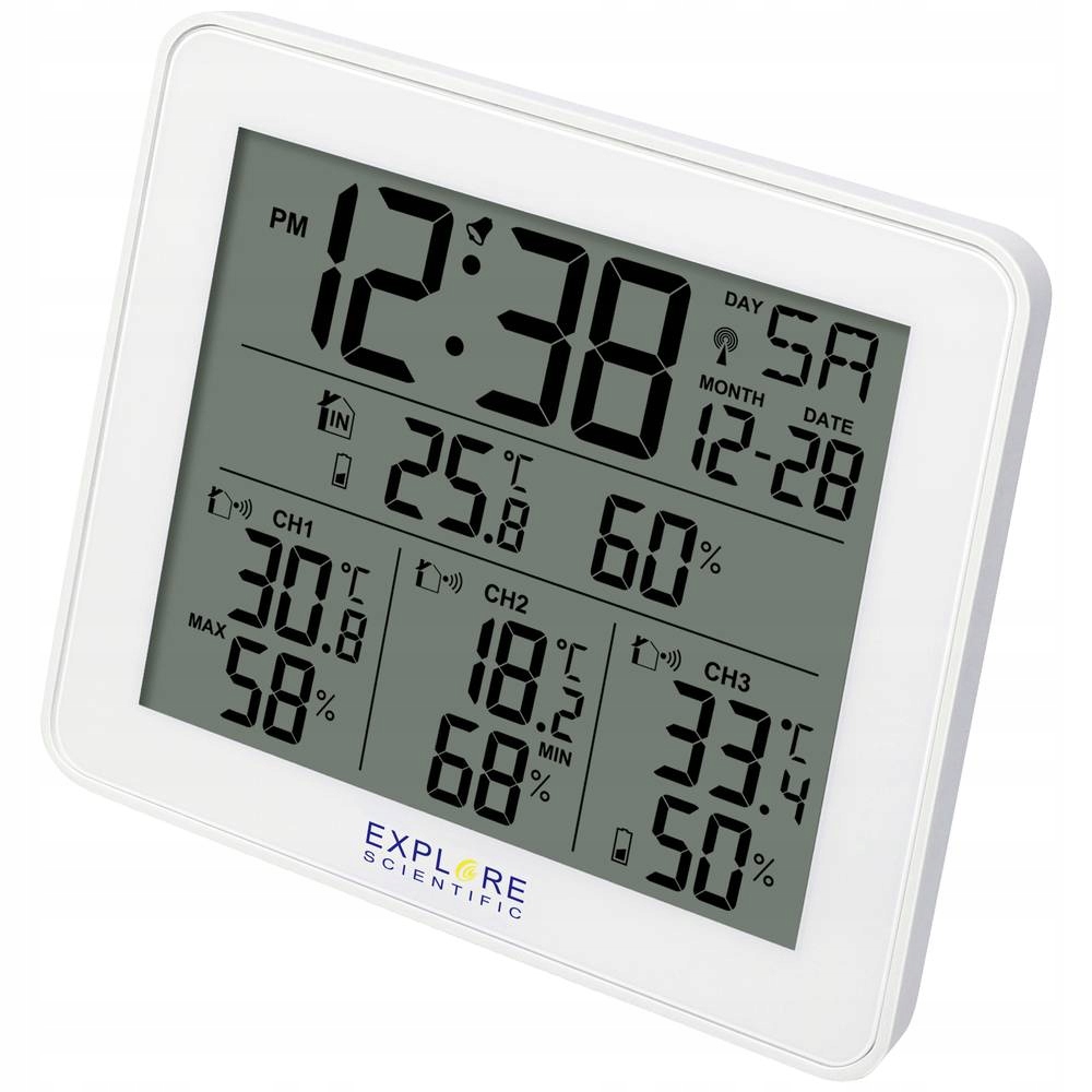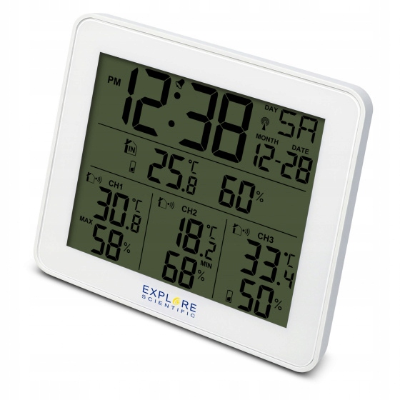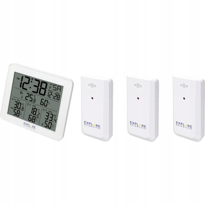 - функціональність метеостанції: дата, день тижня, індекс комфорту, Вологість в приміщенні, кімнатна температура, макс. 3 датчика, макс / хв, зовнішня вологість, зовнішня температура, Радіогодинник (DCF77), температура