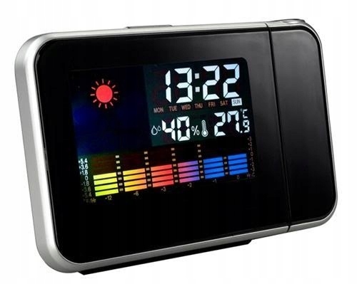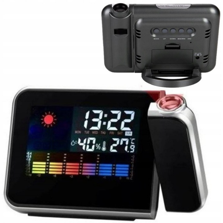метеостанція з вбудованим годинником - фантастичний продукт, який повинен бути на вашому столі, полиці, столі. Станція має великий кольоровий дисплей, на якому відображається поточна температура в приміщенні, вологість і час.крім того, час може бути відображено за допомогою проектора на стіні або стелі, що робить його ідеально видимим навіть у повній темряві.