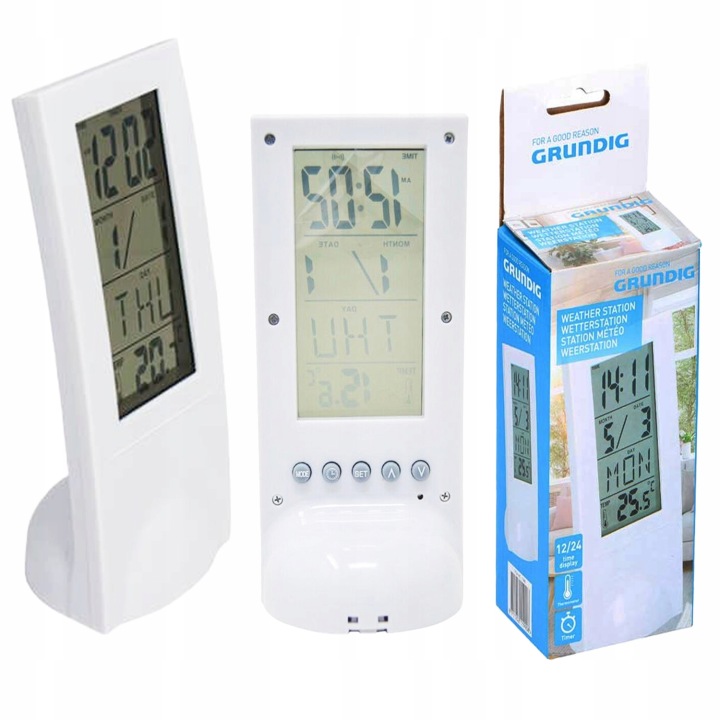 термометр Grundig має простий і елегантний дизайн, який вписується в будь-який інтерʼєр. Призначений для використання всередині приміщень. Вказує температуру повітря в приміщенні. Крім того, він виконує роль годин з двома форматами годин і календарем, що відображає день, місяць і назва тижня.