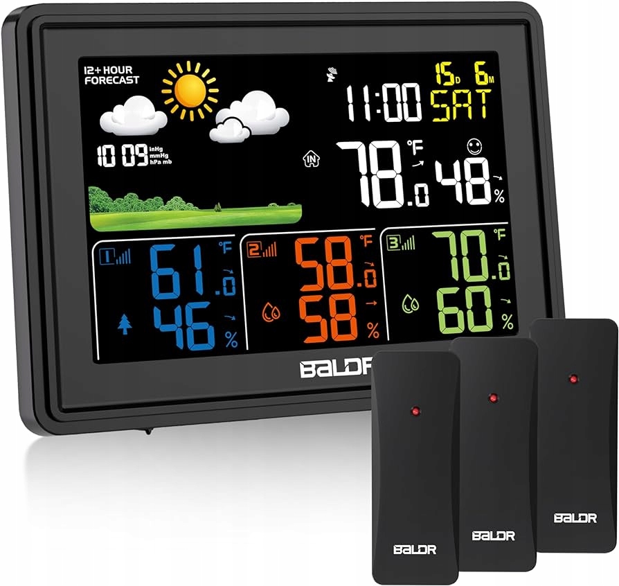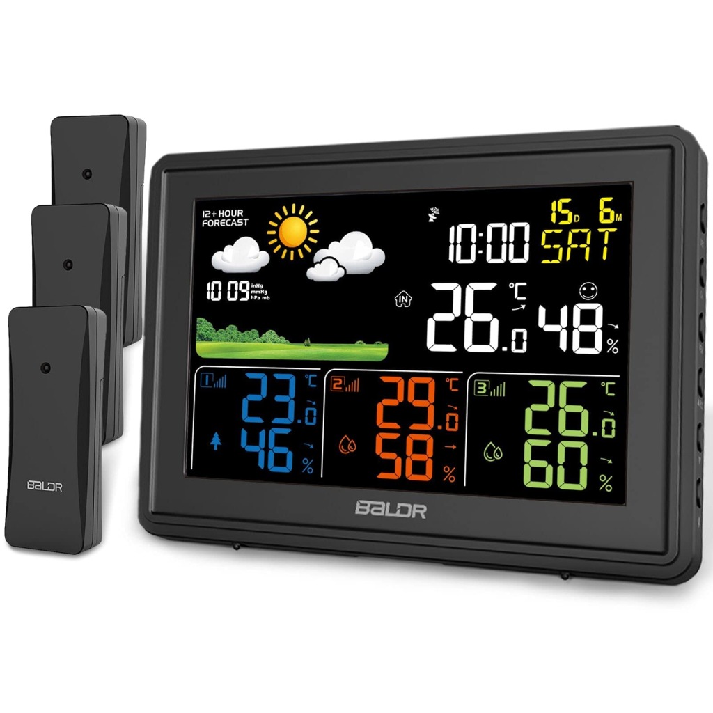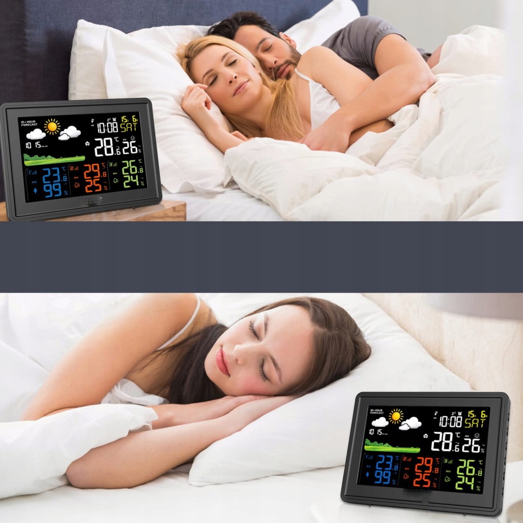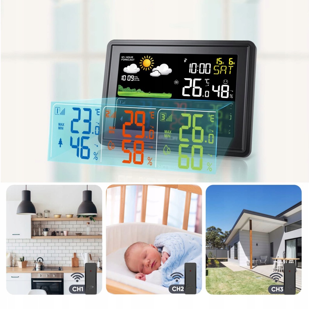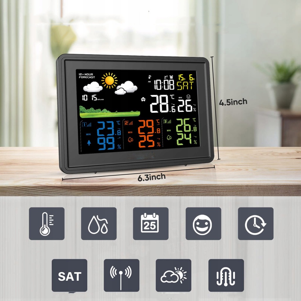 ✅ 【багатофункціональна метеостанція】 наша метеостанція має великий кольоровий дисплей. На екрані ми можемо побачити такі дані: дату, температуру та вологість у приміщенні, температуру та вологість трьох передавачів, час, день тижня (7 мов), тиск повітря, прогноз погоди від 12 до 24 годин, комфорт у приміщенні тощо