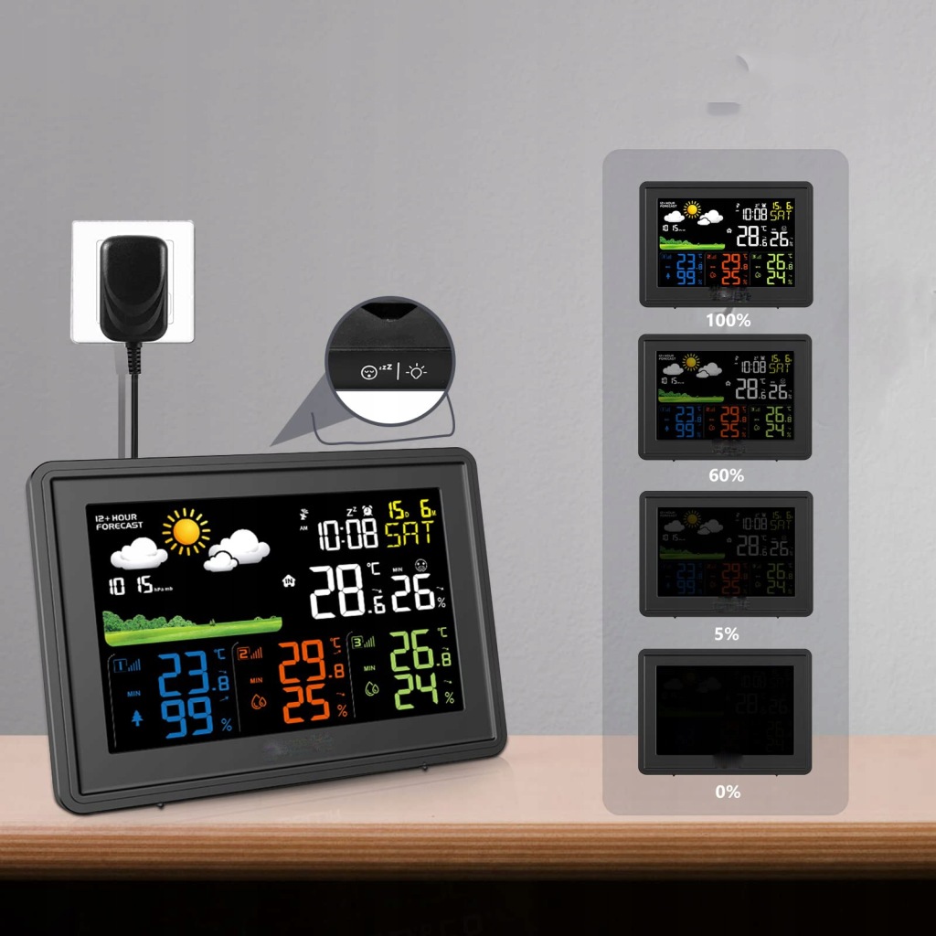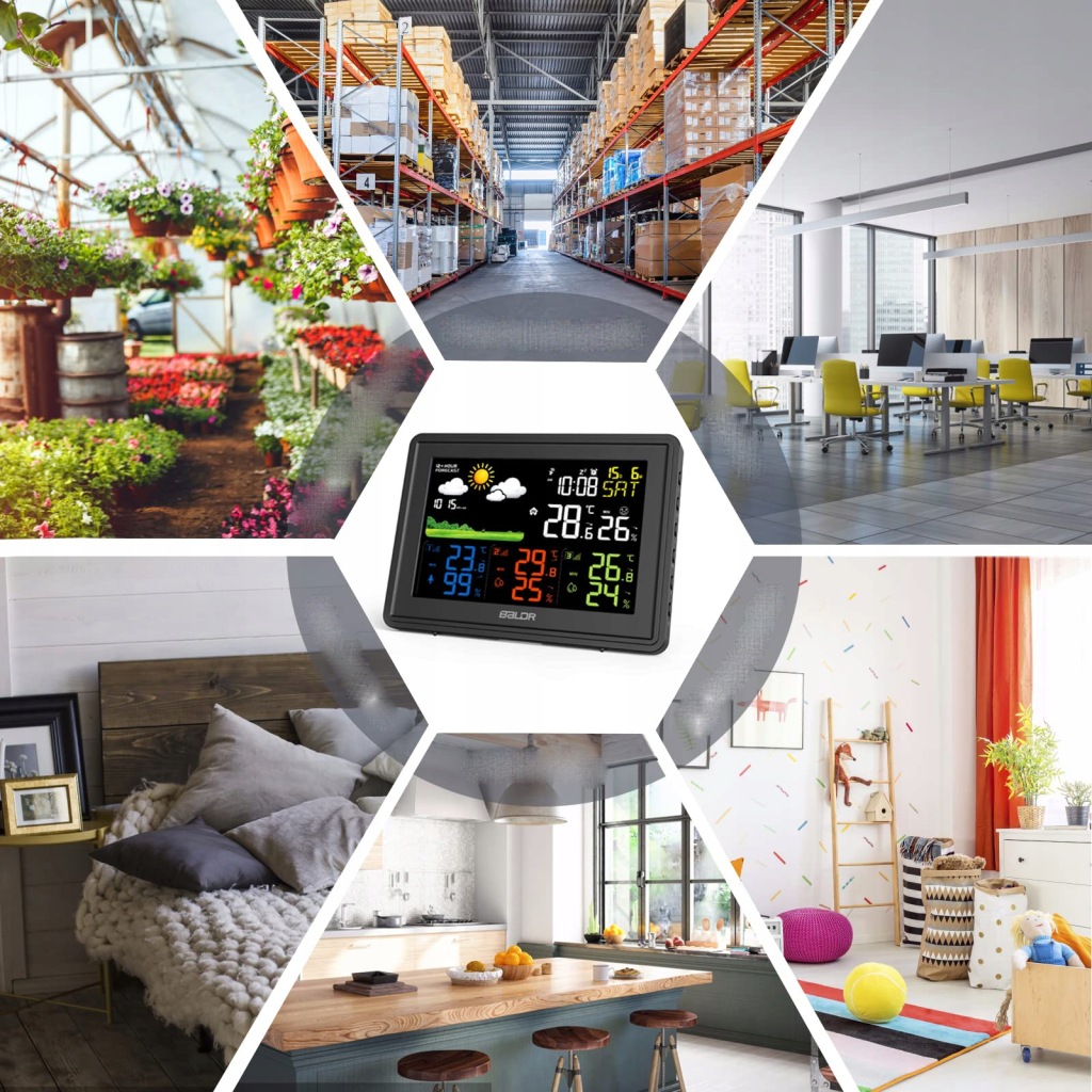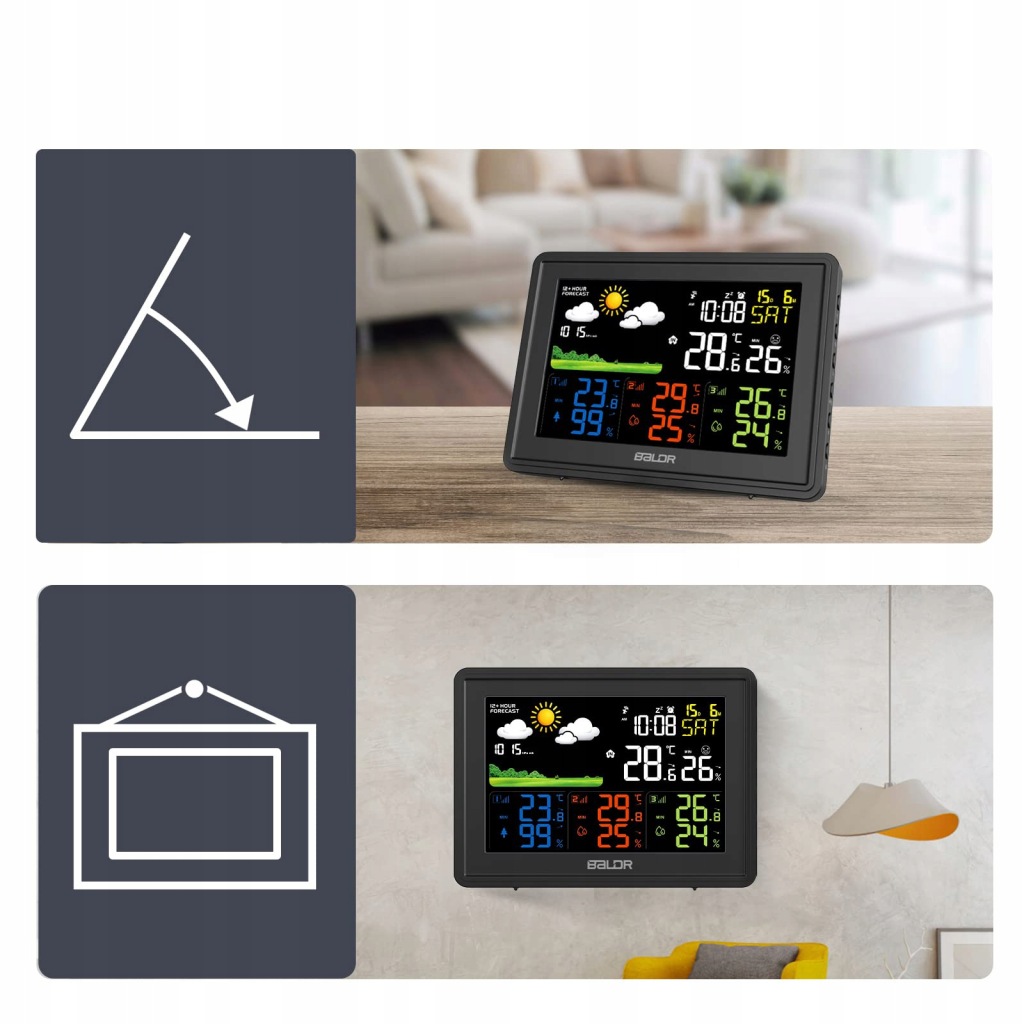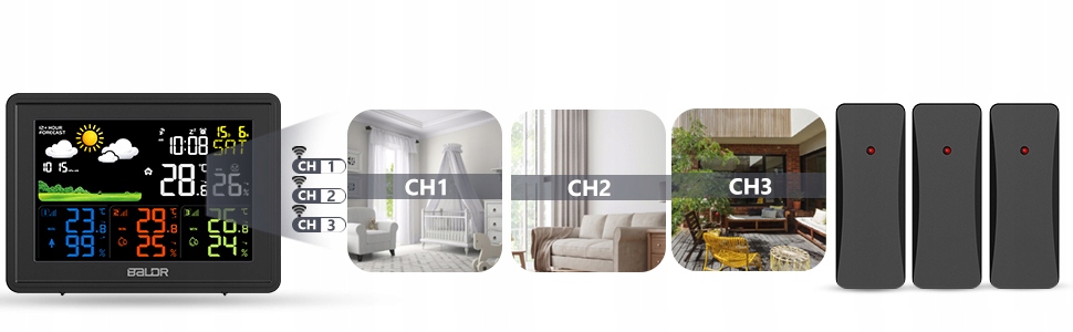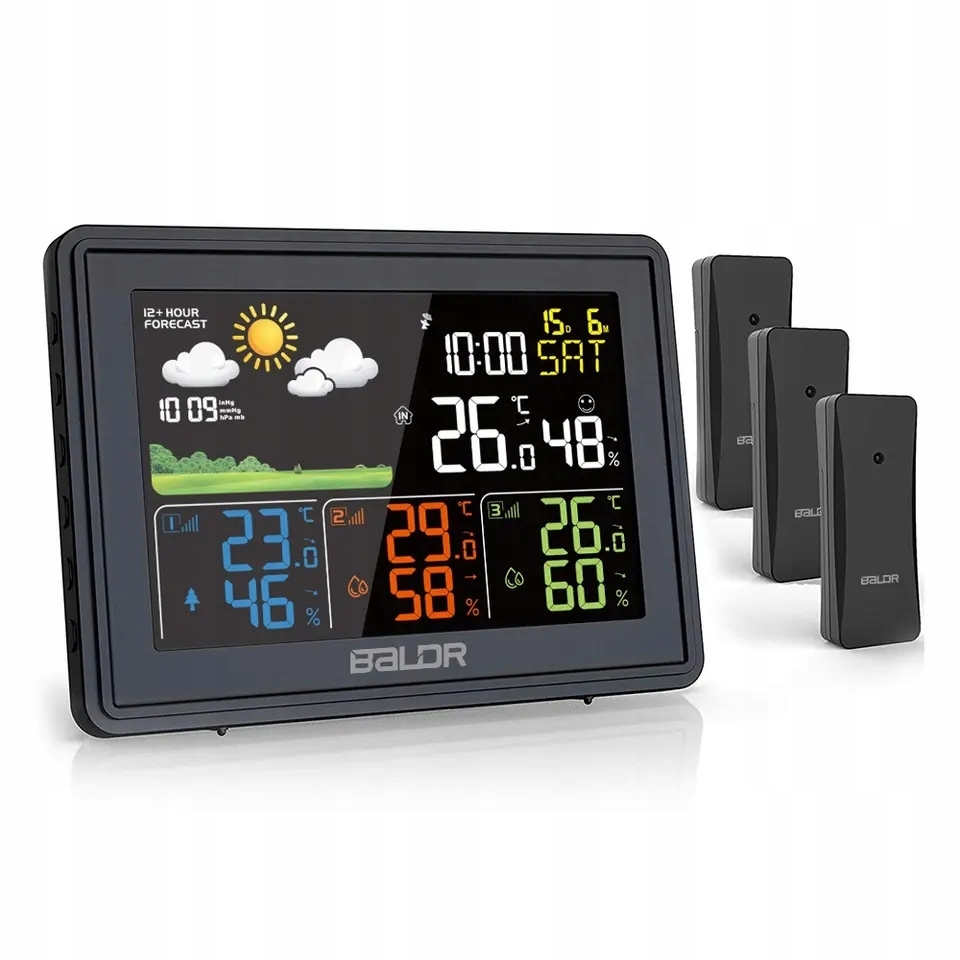 ✅ 【багатофункціональна метеостанція】 наша метеостанція має великий кольоровий дисплей. На екрані ми можемо побачити такі дані: дату, температуру та вологість у приміщенні, температуру та вологість трьох передавачів, час, день тижня (7 мов), тиск повітря, прогноз погоди від 12 до 24 годин, комфорт у приміщенні тощо