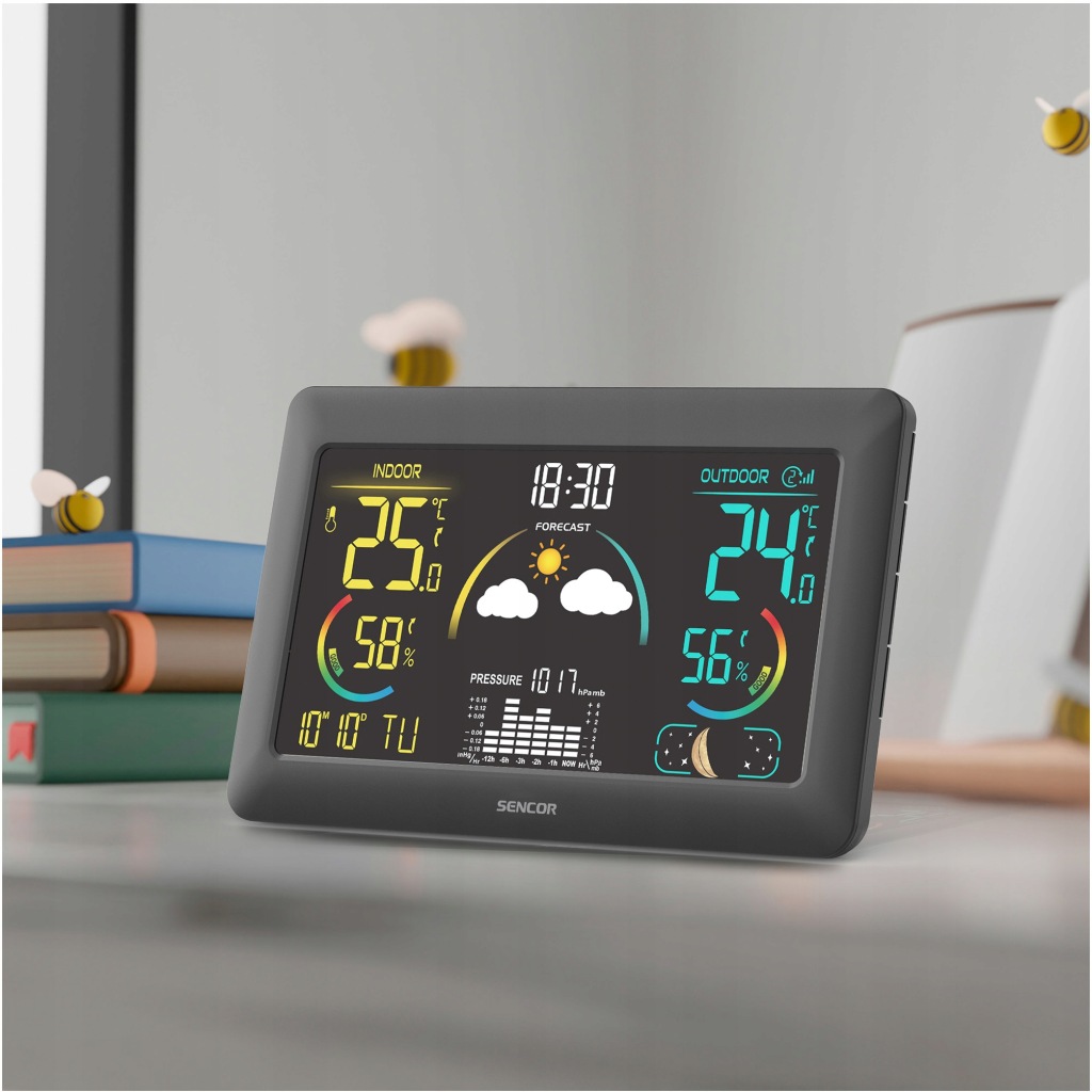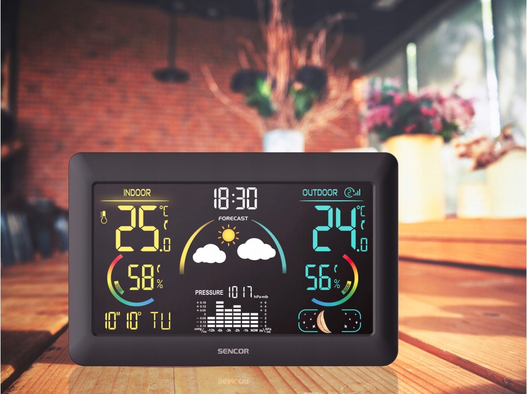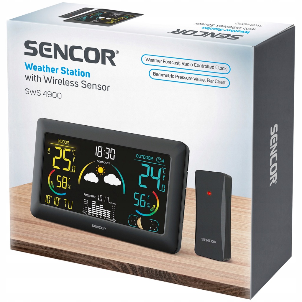морози, грози, літня спека та інші примхи погоди можуть змінити ваш розпорядок дня. Метеостанція Sencor SWS 4900 вас не здивує. Помістіть його в зручне місце в будинку з доступом до мережі або вставте 3 батарейки АА. Зовні в саду або на балконі є зовнішній датчик, який живиться від батарей (2 × AA) і працює без проводів. Його можна розмістити на відстані до 80 метрів від метеостанції. Після декількох хвилин збору інформації датчик відправить поточні дані про погоду на вулицю, які будуть відображатися на кольоровому дисплеї разом з прогнозом на термін до 12-24 годин. Можна придбати додаткові датчики і підключити до станції до 3.