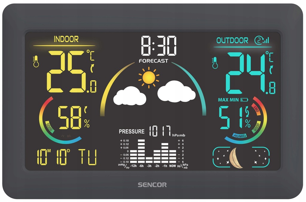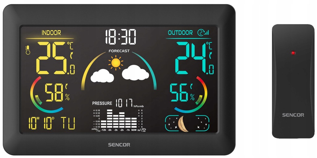 метеостанція має позначку часу (доступний формат часу 12 годин і 24 години), керовану радіосигналом DCF77. Ви можете встановити будильник на повтор і поставити станцію на тумбочку, щоб почати свій день з прогнозу погоди. Щоб станція не заважала вам ввечері, є можливість затемнення яскравості. Вас також напевно зацікавить значок фази місяця або час сходу і заходу сонця. Метеостанція SENCOR-приємне доповнення до будь-якого домашнього господарства.