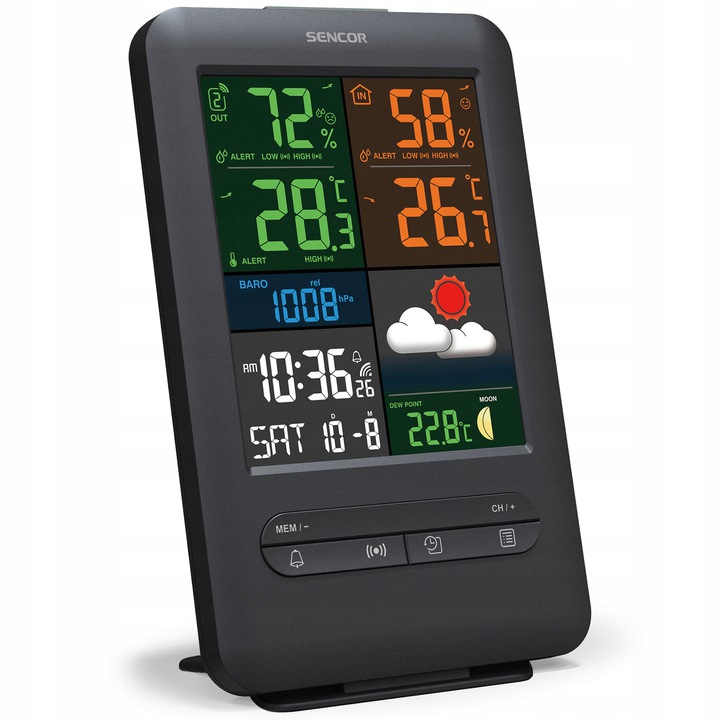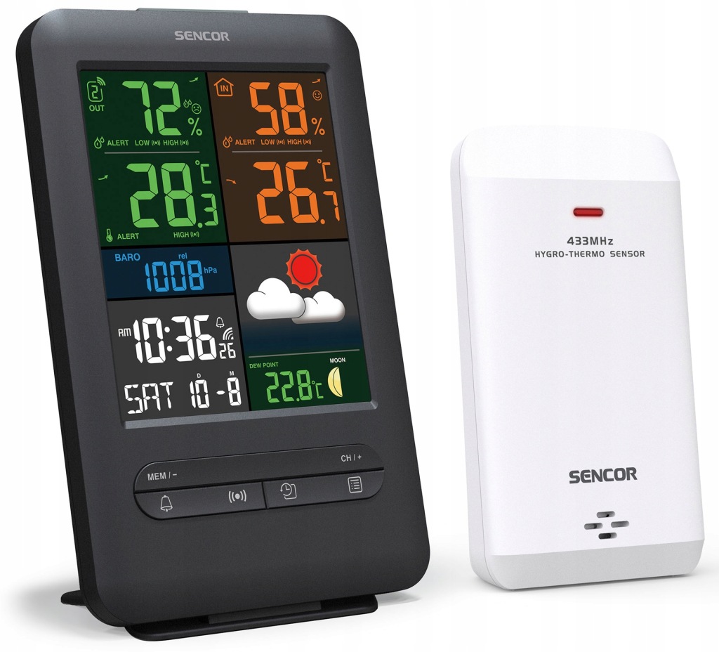високоякісна Цифрова метеостанція з РК-дисплеєм. Пропонує: електронний термометр, будильник, історію показань, прогноз погоди. Підходить для настінного монтажу. Він включає в себе естетично зроблений високоточний датчик з внутрішніми датчиками. Перевага продукту-великий і дуже читабельний РК-дисплей.